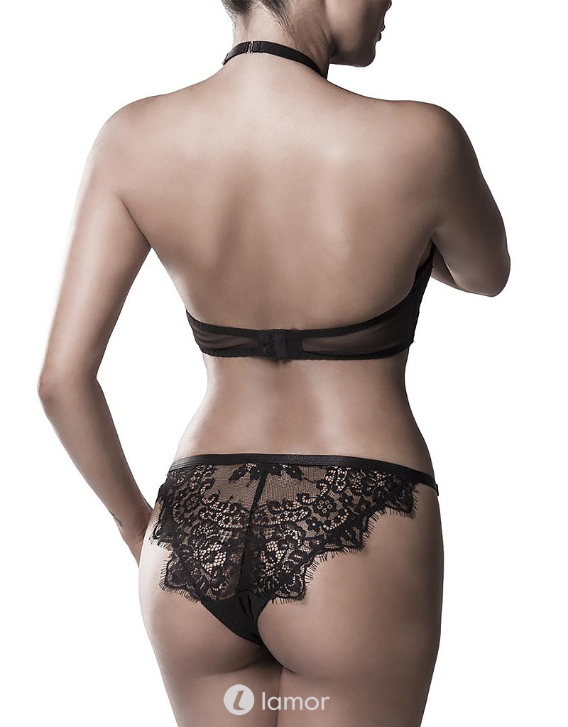 Lief lingerie-setje bestaande uit een topje en slipje van transparante, elastische kant met bloemmotief. Met beugelcups en halternek. Inclusief bijpassende slip.
