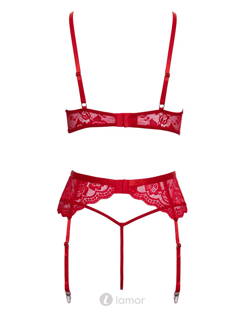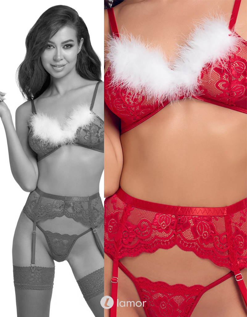 Cottelli Lingerie X-Mas 3-delig lingerieset met bh, jarretelgordel en string – rood met witte verenrand