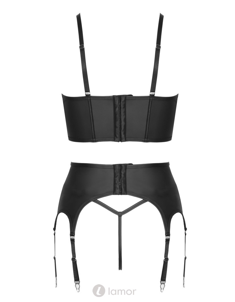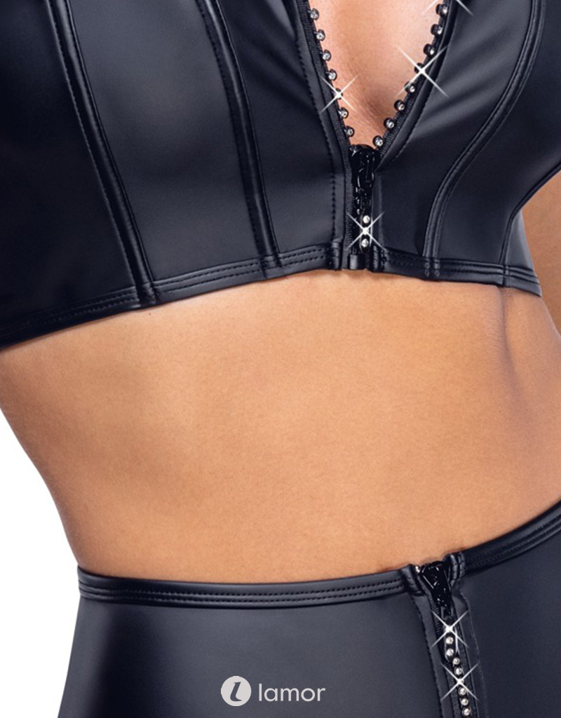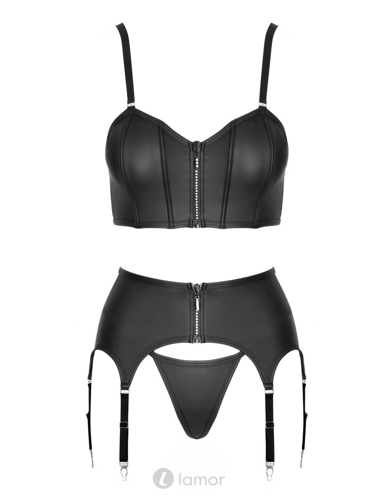 Verleidelijke 3-delige set van Cottelli Lingerie met corsagentop, strapsgordel en string in zwart mattlook met fonkelende strass-ritsen