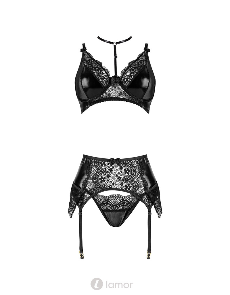 Sexy zwart 3-delige lingerie set Fantasie van wetlook en kant
