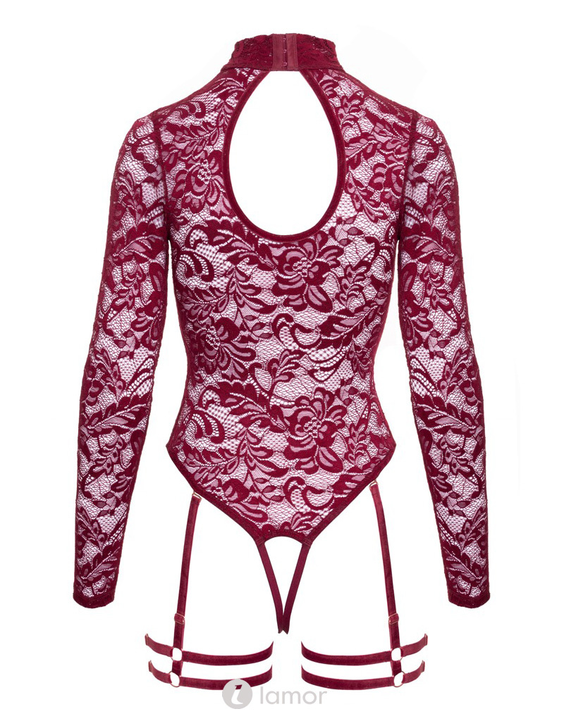 Exclusieve Abierta Fina Ouvert Body in bourgondisch rood kant met cut-outs, roségouden kettingen, jarretel-harnas en open kruis