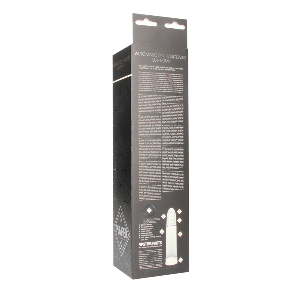 Beschrijving With a total cylinder length of 20 cm (7.8) and a diameter of 6 cm (2.36), this USB rechargeable high-quality pump gives you ample possibilities to grow in both directions! The insertion sleeve is made of smooth Silicone. Surprise yourself every time on how big you can get! At the touch of a button, the extremely powerful rechargeable pump will create a super strong vacuum, giving you a quick and powerful erection. The soft silicone opening will create a tight yet comfortable seal. WARNING: Please read product manual before using any type of vacuum pump orconstriction ring. Stop using the devices immediately if you experience any pain or discomfort.