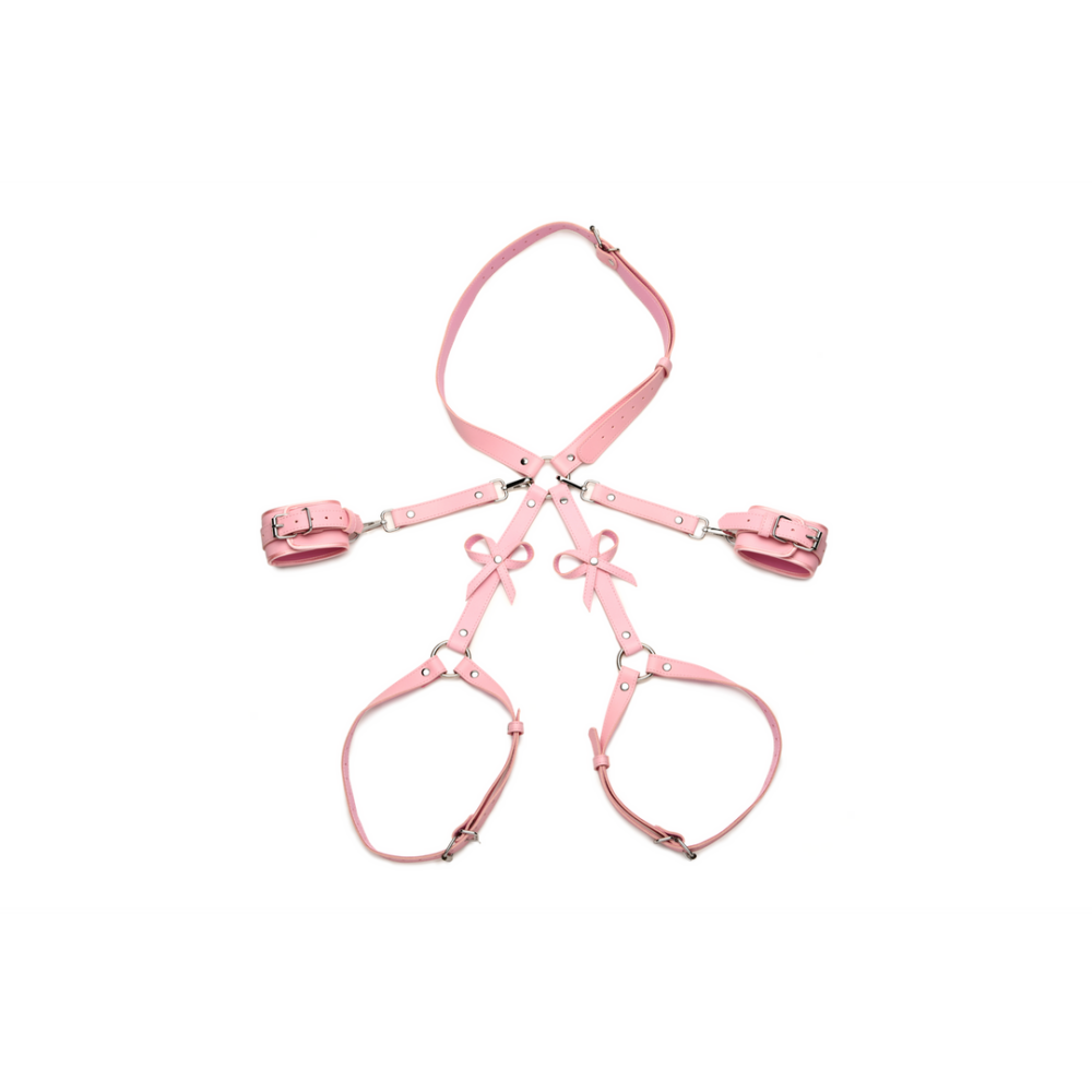 Het gebruik van je lichaam is een cadeau behandel het als zodanig met dit bondage harnas en wikkel je taille, dijen en polsen als een mooi, klein pakketje - het heeft zelfs strikjes inbegrepen! Gemaakt van roze, duurzaam PU nepleer, is het veganistisch vriendelijk en gemakkelijk te reinigen of af te vegen na elk gebruik. De polsbandjes sluiten met nikkelvrije, zilverkleurige metalen gespen. Pas de gespen aan op de dijbanden, tailleband en polsbandjes voor een op maat gemaakte en comfortabele pasvorm. Benadruk je rondingen en laat je partner watertanden van lust en verlangen terwijl je jezelf presenteert als het object van hun bewondering, een gebonden en onderdanige speelpartner die klaar is om de nacht op te fleuren! Bevestig jezelf of, nog beter, laat je partner je beperkingen opleggen! Terwijl elke gesp een band strakker trekt, geniet van het gevoel gebonden te zijn. Zelfs symbolisch kan je geest beginnen te verschuiven naar onderdanigheid en ontvankelijkheid voor geweldige, heerlijke en afwijkende ideeën die jullie samen kunnen verkennen! Zorg ervoor dat het niet te strak is, zodat het je bloedstroom niet belemmert. Met je polsen achter je rug getrokken door de banden, kniel voor je partner terwijl zij de rol van Mister, Mistress, Dominant of zelfs Daddy spelen! Voeg je favoriete speeltjes toe en ga verder met voorspel om deze scène echt rijk en sensueel te maken! Na gebruik, reinig elk deel van het harnas dat aandacht nodig heeft met een zachte doek en speelgoedreiniger. Afmetingen: Taille past van 66 cm tot 107 cm omtrek. Dijbenen passen van 33 cm tot 66 cm omtrek. Polsbandjes passen van 14,5 cm tot 26 cm omtrek. Materialen: PU leer, metaal Kleur: Roze, zilver Belangrijkste Kenmerken: Mooie Bondage: Geniet van hoe dit harnas je taille, dijen en polsen beperkt met banden en polsbandjes. Toegevoegd aan het ontwerp zijn kleine strikjes die de achterkant van je dijen accentueren! PU Leer: Gemaakt van veganistisch vriendelijk, duurzaam PU nepleer. Reinigen indien nodig. Verstelbare Gespen: Alle banden zijn verstelbaar via de gespen en gaten. Nikkelvrij Metaal: Het gebruikte metaal is nikkelvrij en lichaamsveilig.