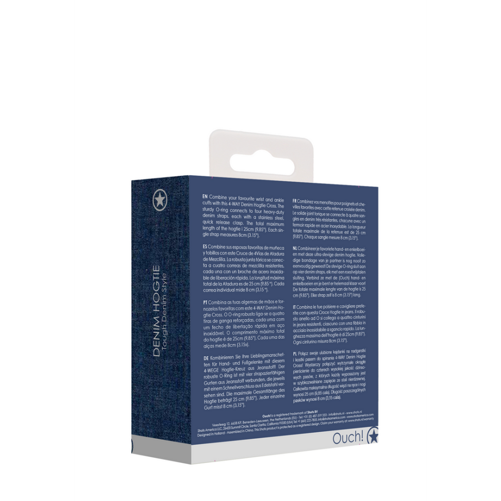 Combine your favourite wrist and ankle cuffs with this 4-WAY Denim Hogtie Cross. Full body restraint has never been so easy, just clip your sub's arms and legs behind their back, or in front, for total control and submission! This Denim Hogtie will look absolutely amazing in any BDSM, beginners, as well as advanced players, collection! The sturdy O-ring connects to four heavy-duty denim straps, each with a stainless steel, quick release clasp. Just clip them onto (Ouch) hand and ankle cuffs and you're ready to play. This sturdy fabric will seamlessly blend in with anything you wear during your kinky role play! The popular world of Ouch! Denim will keep your sub secure while looking fiercely fabulous! The total maximum length of the hogtie is 25cm (9.85). Each single strap measures 8cm (3.15).