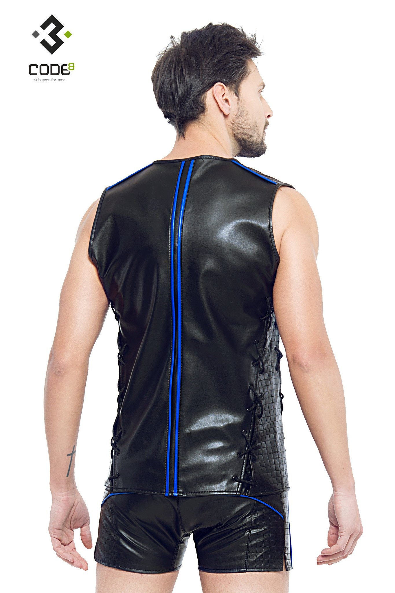 Eco-leder mouwloos shirt met blauw gekleurde biezen