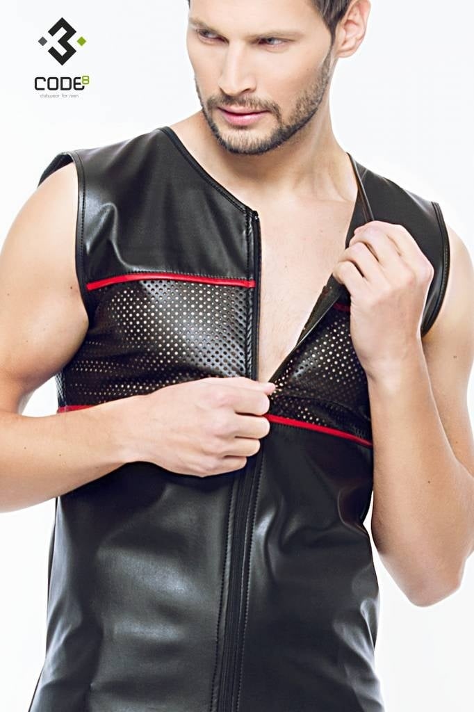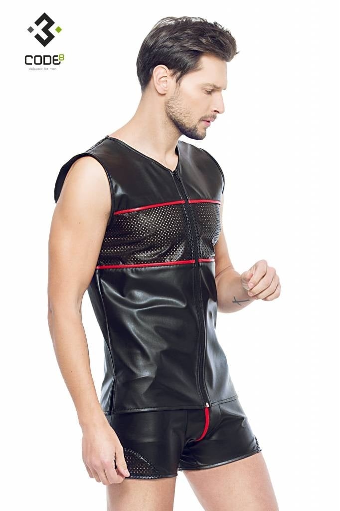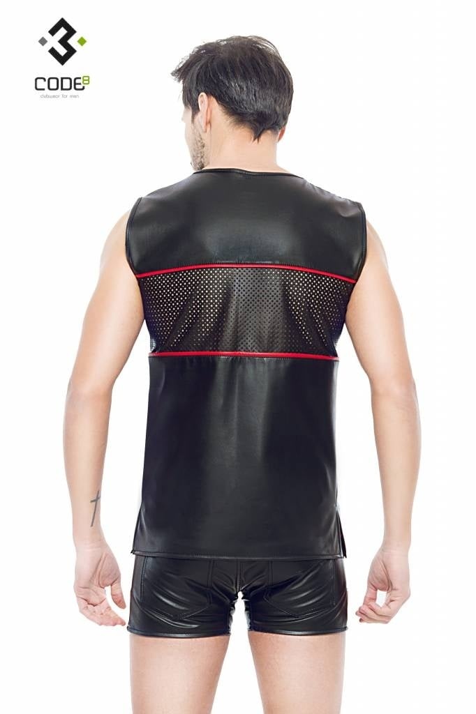 Eco-Leder Shirt met mesh aan voor en achterzijde en rode bies