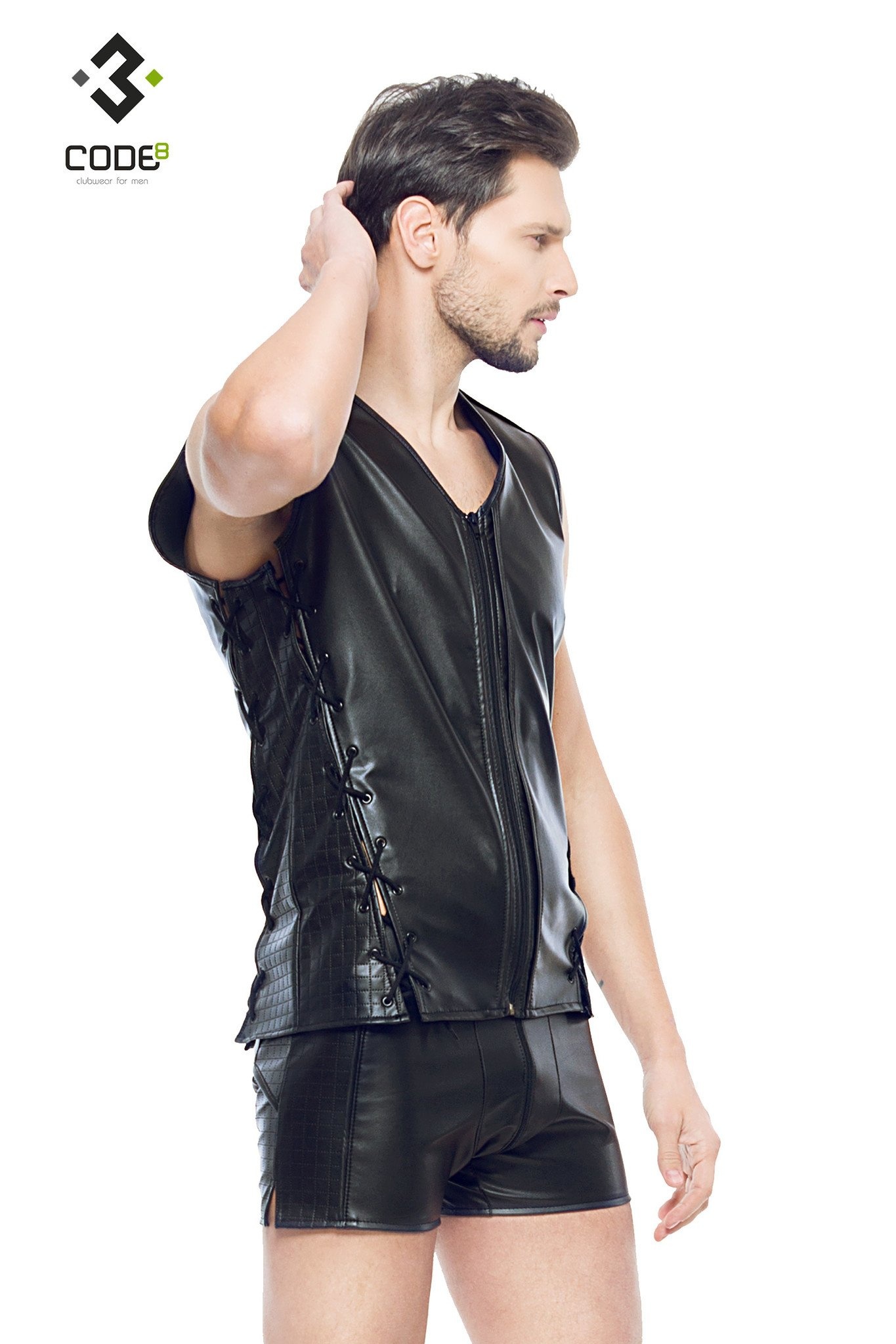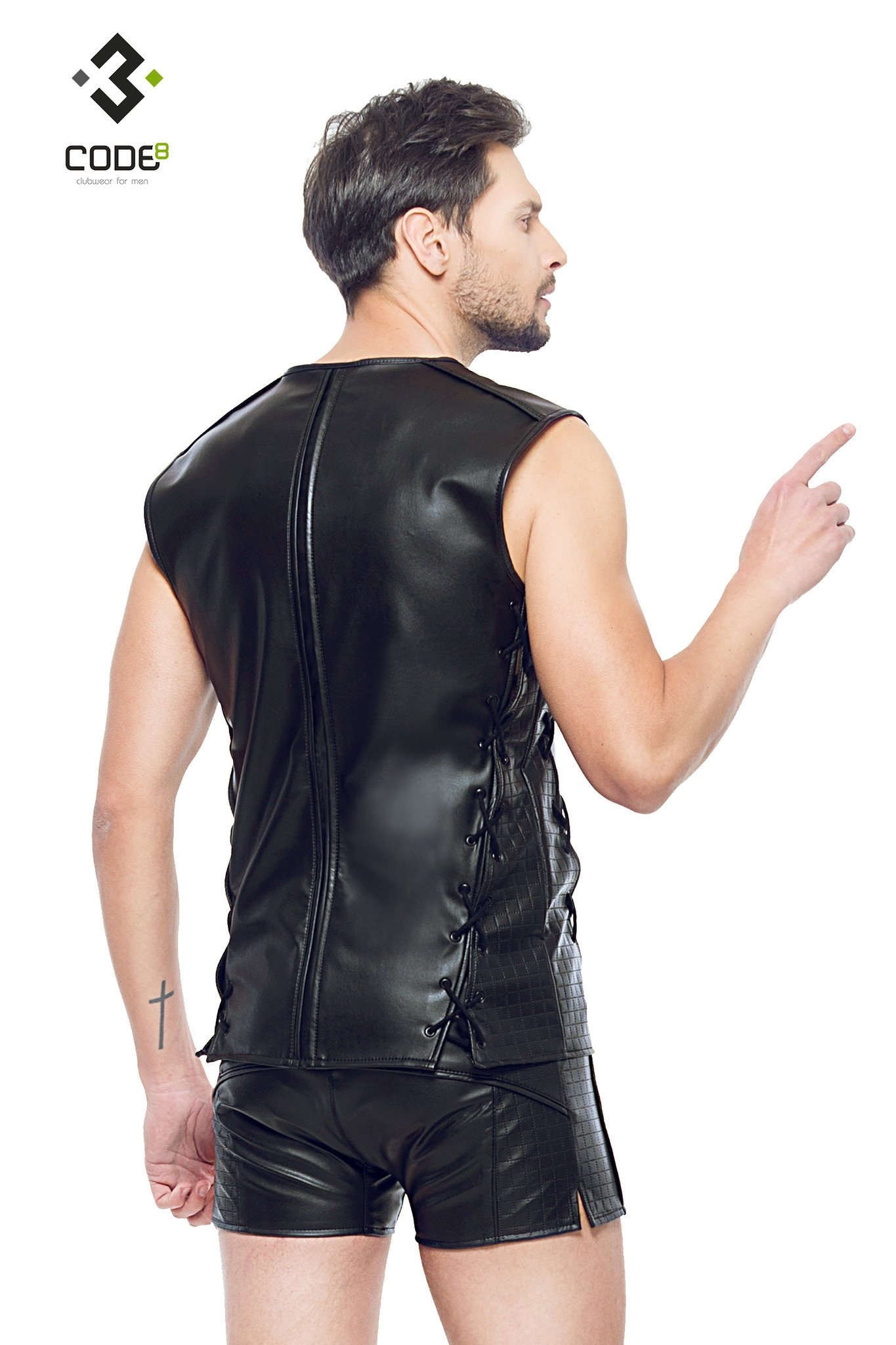 Eco-Leren mouwloos shirt met gekleurde biezen aan voor en achterkant. Het shirt heeft sierveter aan beide zijden en een inzet aan de zijkanten van eco-leer met een blokmotief. Het shirt sluit aan de voorzijde met een rits.