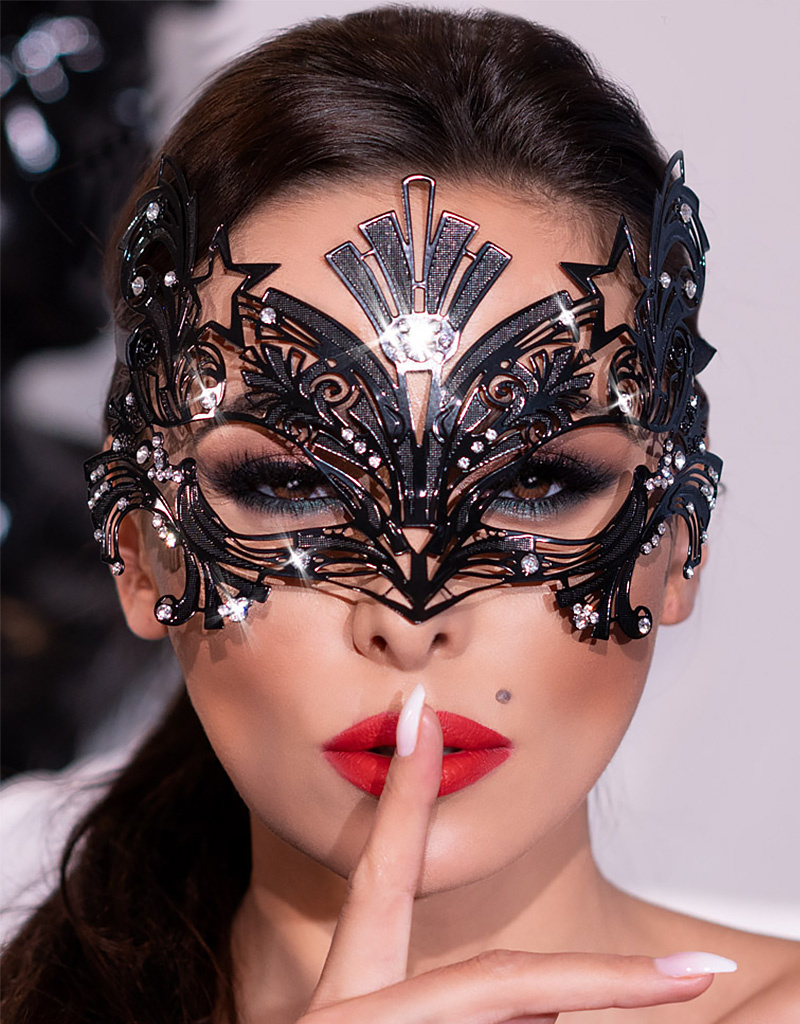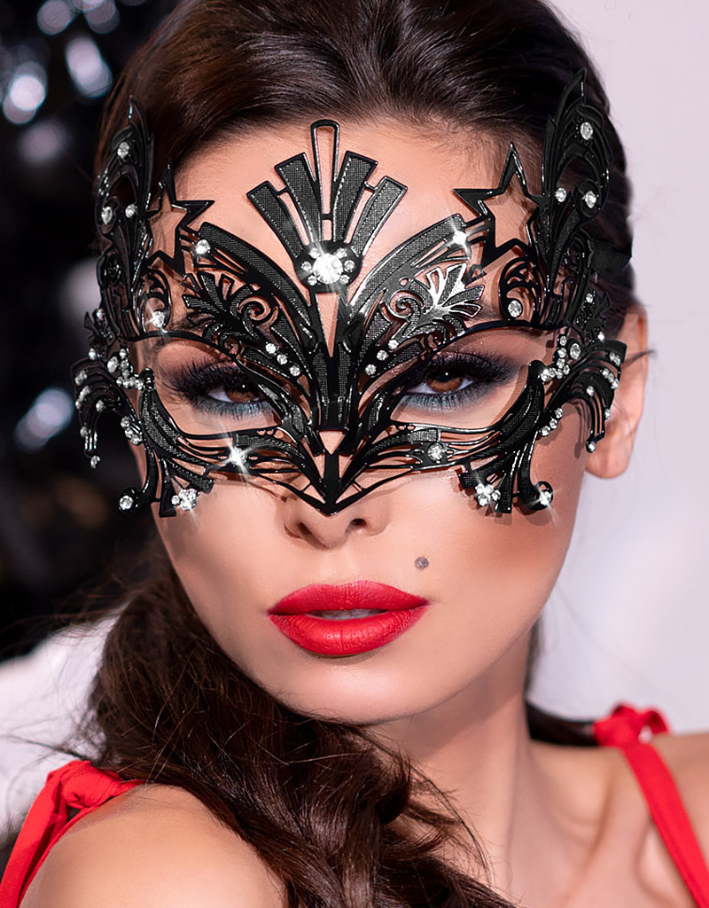 Dit filigraan koperen masker in kattenlook is versierd met glinsterende edelstenen. Het kan met satijnen linten worden vastgebonden en perfect worden aangepast.