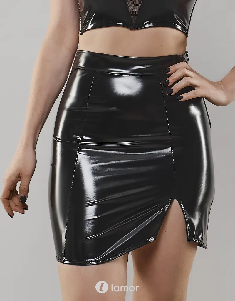 Demoniq halflange zwarte lak rok vinyl TDEulalia001