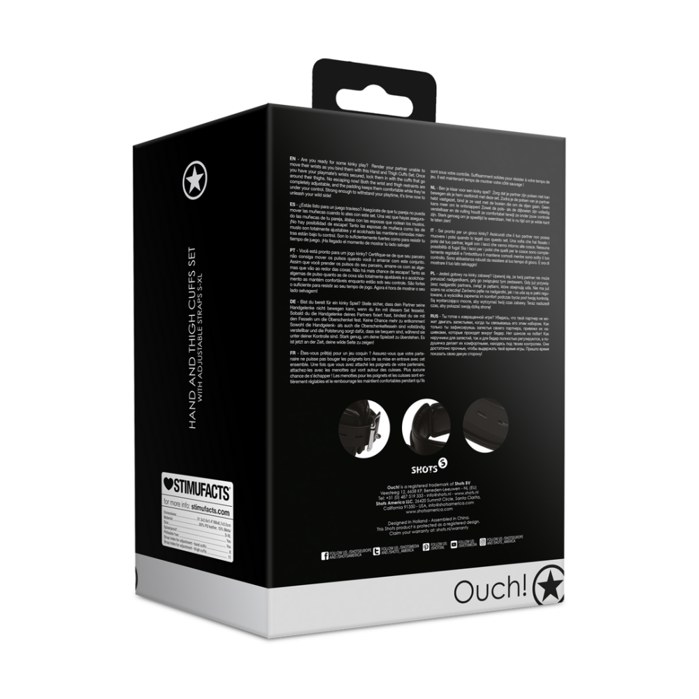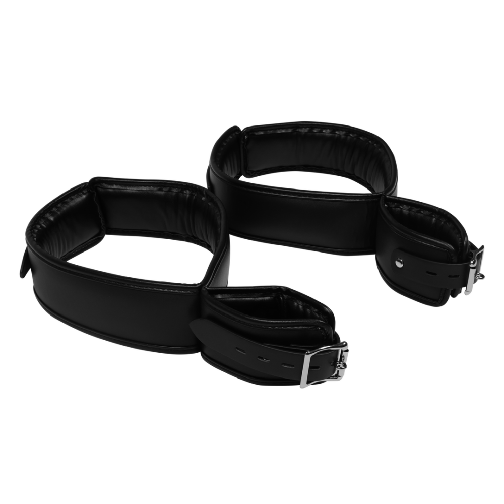 Beschrijving Ben je klaar voor een kinky spel? Zorg dat je partner zijn polsen niet kan bewegen als je hem vastbindt met deze set. Zodra je de polsen van je partner hebt vastgezet, bind je ze vast met de boeien die om de dijen gaan. Geen kans meer om te ontsnappen! Zowel de pols- als de dijboeien zijn volledig verstelbaar en de vulling houdt ze comfortabel terwijl ze onder jouw controle zijn. Sterk genoeg om je speeltijd te weerstaan. Het is nu tijd om je wilde kant te laten zien!