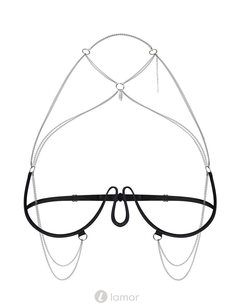 Luxe Harnas Bra Lustique van Obsessive in zwart met ouvert design, zilverkleurige kettinkjes en handgemaakte premium afwerking
