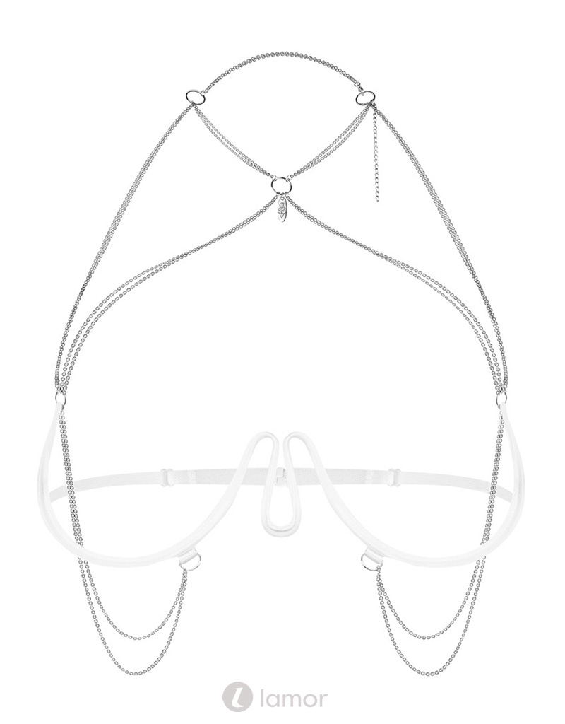 Luxe Harnas Bra Lustique van Obsessive in wit met ouvert design, zilverkleurige kettinkjes en handgemaakte premium afwerking
