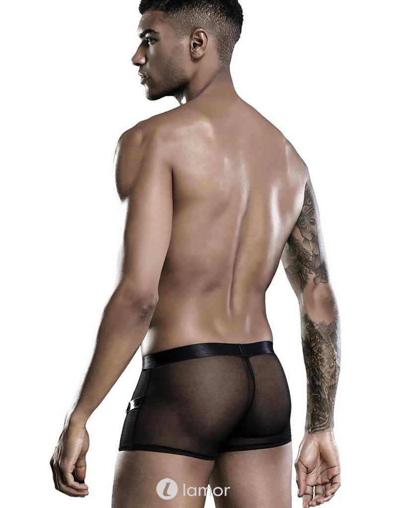Zwarte heren boxer van Saresia. Met elastische tailleband in combinatie van rekbaar wetlook en tulle zij en achterkant en tule inzetstukken.