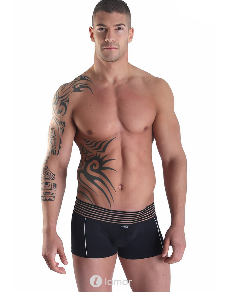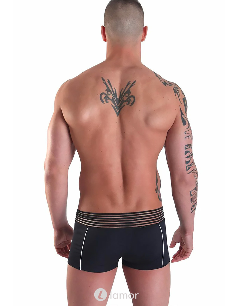 Heren boxer gemaakt van zachte ondoorzichtige stof met witte bies en gestreepte tailleband