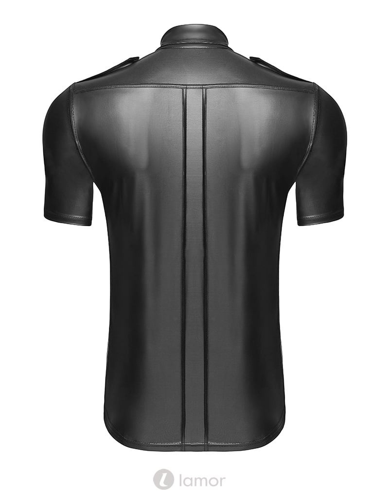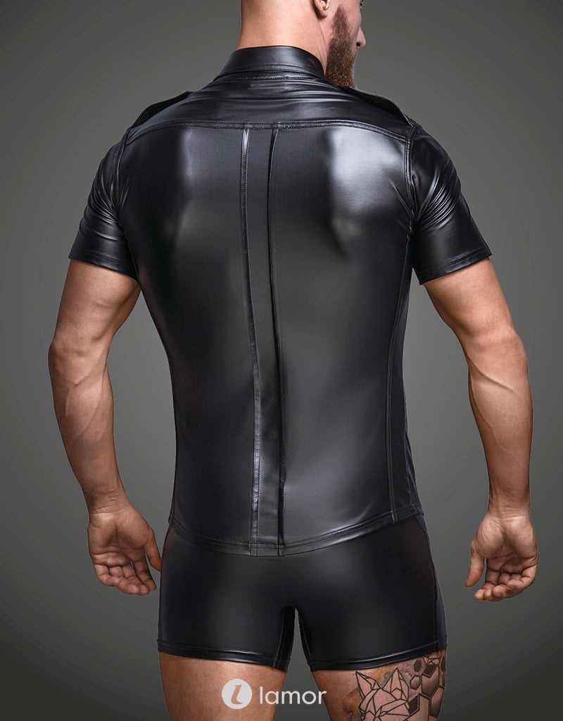 Chique shirt met korte mouwen van Noir Handmade gemaakt van een mat wetlook materiaal. Het nauwsluitende model benadrukt je sexy figuur. De twee borstzakken en de epauletten geven het shirt een duidelijk gestructureerde lijn die bijna doet denken aan een uniform. Het shirt wordt afgesloten met een reeks drukknoppen.