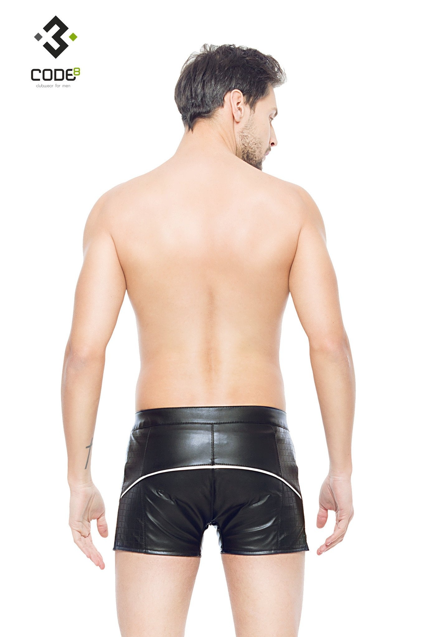 Eco-Leren Short met rits aan voorzijde en met aan beide zijden een opvallend kunstleer met een blokmotief. En zilverkleurige bies.