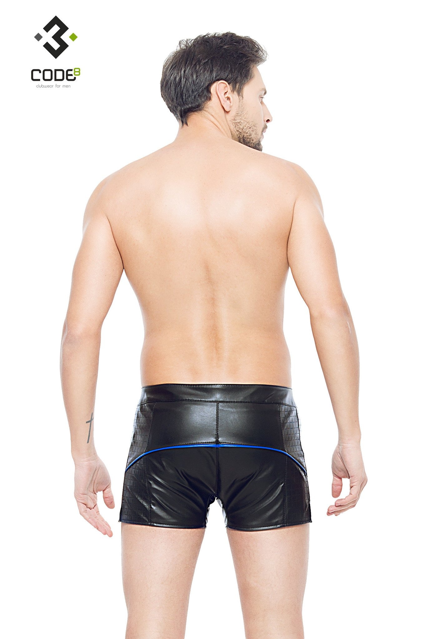 Eco-Leren Short met rits aan voorzijde en met aan beide zijden een opvallend kunstleer met een blokmotief. En blauwkleurige bies.