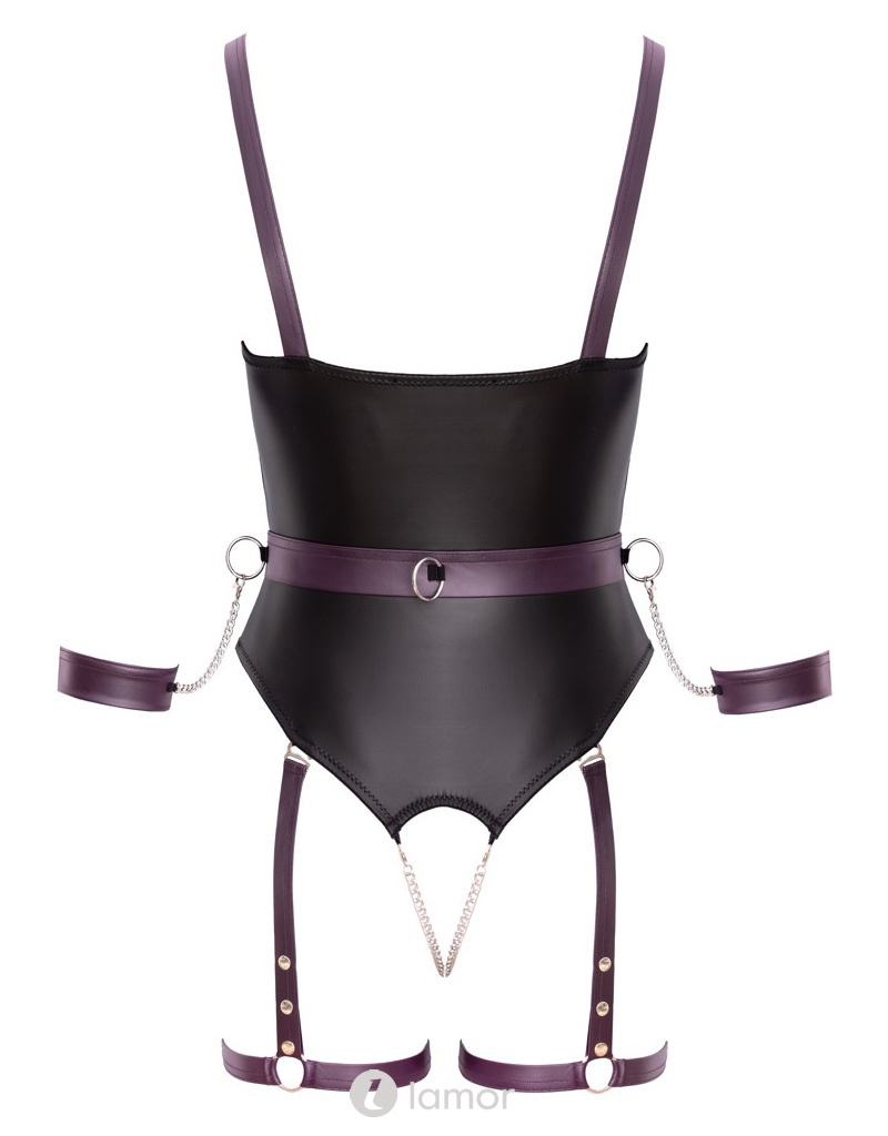 Cottelli Bondage Jarretel-Body Ouvert met Lange Mouwen, Ritsen over de Borsten, Open Kruis, Afneembare Dijbanden & Handboeien – Netstof en Mattlook