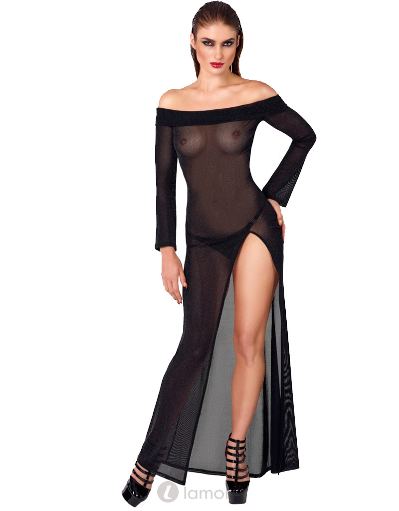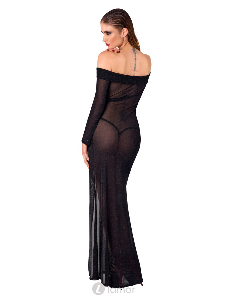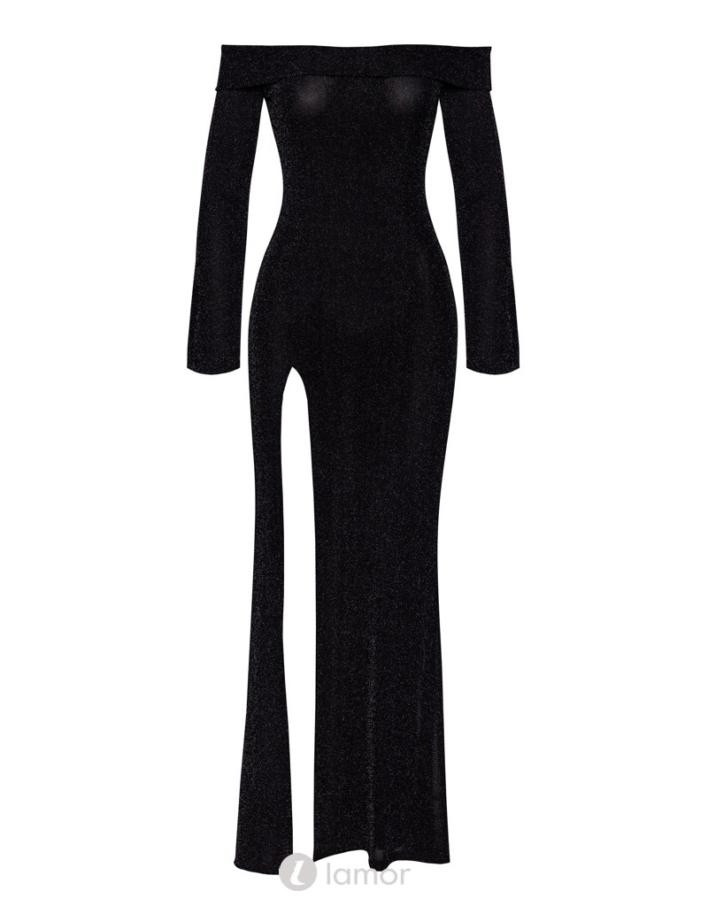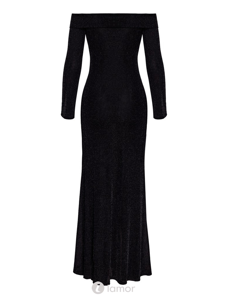 Noir Handmade Enkellange Jurk van zwarte glitter-transparantie met Carmen-halslijn, trompetmouwen en hoge split