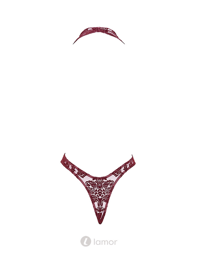 F386 Kink Royal Cascade Body – Bourgondische Flocked Tulle Body met Watervalhals en Open Rug
