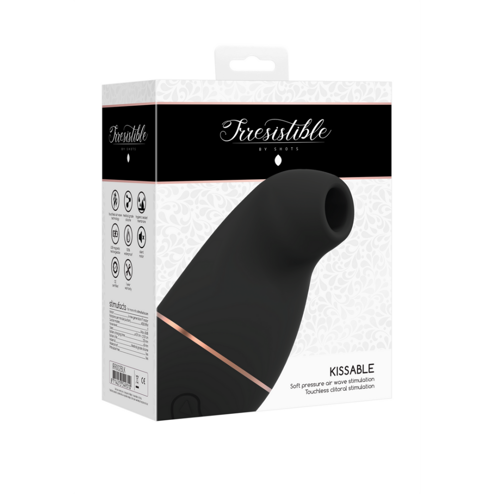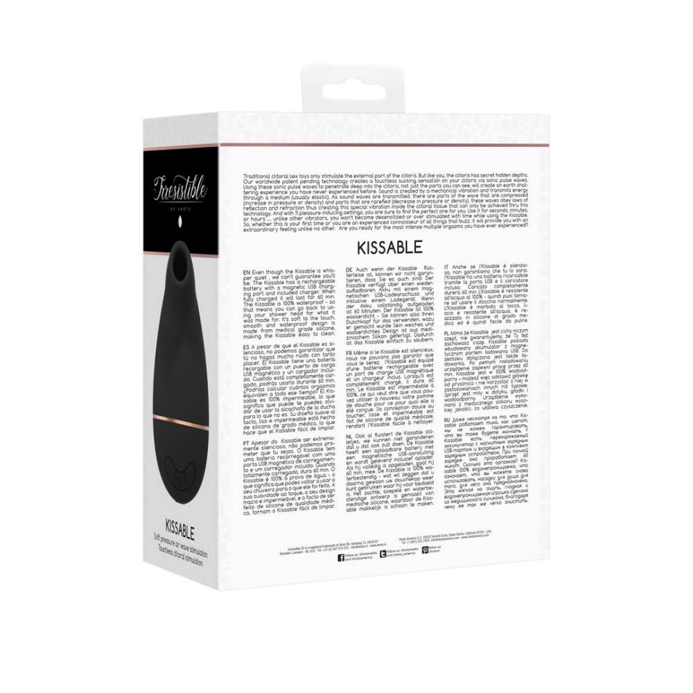 Beschrijving Ook al fluistert de Kissable stilletjes, we kunnen niet garanderen dat u dat ook zult doen. De Kissable heeft een oplaadbare batterij met een magnetische USB-aansluiting en wordt geleverd inclusief oplader. Als hij volledig is opgeladen, gaat hij 60 min. mee. De Kissable is 100% waterbestendig - wat wil zeggen dat u daarna gewoon uw douchekop weer kunt gebruiken waar hij voor bedoeld is. Het zachte, soepele en waterbestendige ontwerp is gemaakt van medische silicone, waardoor de Kissable makkelijk is schoon te maken.Touchless Airwave-technologieDe Irresistible Collection is niet zomaar een collectie seksspeeltjes. Ze zijn de beste seksspeeltjes op de markt voor vrouwen. Dat is een feit! Wat de Irresistible Collection zo bijzonder maakt is dat onze clitorisvibrator vervaardigd is uit hoogwaardige siliconen en dat hij uitgerust is met onze Touchless Airwave-technologie.De Irresistible Collection is de ideale combinatie van geavanceerde technologie, hoge kwaliteit, esthetiek en een ergonomisch ontwerp. De technologie werkt door de clitoris zachtjes en onrechtstreeks te stimuleren met elf verschillende intensiteitsniveaus van superzacht tot krachtig. Dit mooi ontworpen speeltje omringt uw clitoris zonder hem aan te raken en stimuleert hem via de zachte druk van luchtgolven, waardoor er een unieke weefselpenetrerende vibratie teweeggebracht wordt die niet behaald kan worden zonder het gebruik van deze technologie. (Geluidsgolven kunnen door verschillende media reizen, waaronder vloeistoffen en vaste stoffen. De gemiddelde golfsnelheid voor geluid in lichaamsweefsels is 1540 m/s en de snelheid van het geluid varieert ook naargelang het medium waardoor er gereisd wordt. Geluidsgolven reizen sneller door spierweefsels dan door vloeistoffen). Dankzij de creatie van onze Touchless Airwave-technologie zijn we in staat om de perfecte geluidsgolfpulsatie te creëren die door weefsel kan reizen en de uiteinden van de clitoriszenuwen stimuleert, waardoor u de diepste orgasmen ooit zult krijgen!Dit is geen vibrator zoals andere die uw clitoris kunnen irriteren of ongevoelig maken door overstimulatie. De Irresistible Collection leidt niet tot overstimulatie dankzij de Touchless Airwave-technologie. Bent u klaar om de meest intense orgasmen van uw leven te ervaren?Waterbestendig en hygiënisch verzegeld membraanDe Irresistible Collection is 100% waterbestendig met een IP70-beschermingsgraad (de hoogst mogelijke graad). Dit betekent dat u nu uw douchekop weer kunt gebruiken voor datgene waarvoor hij oorspronkelijk gemaakt is. De vibrator is ook uitgerust met een hygiënisch verzegeld membraan van medische kwaliteit om te vermijden dat er vloeistoffen in het mechanisme van het speeltje terechtkomen.