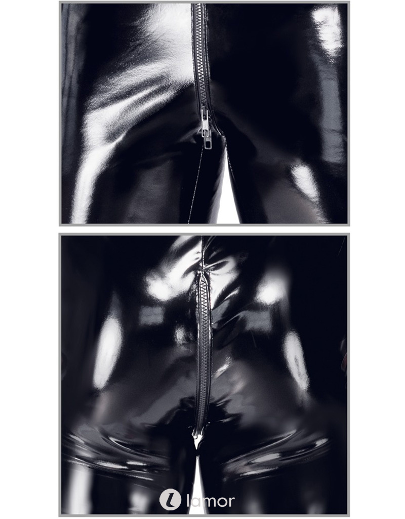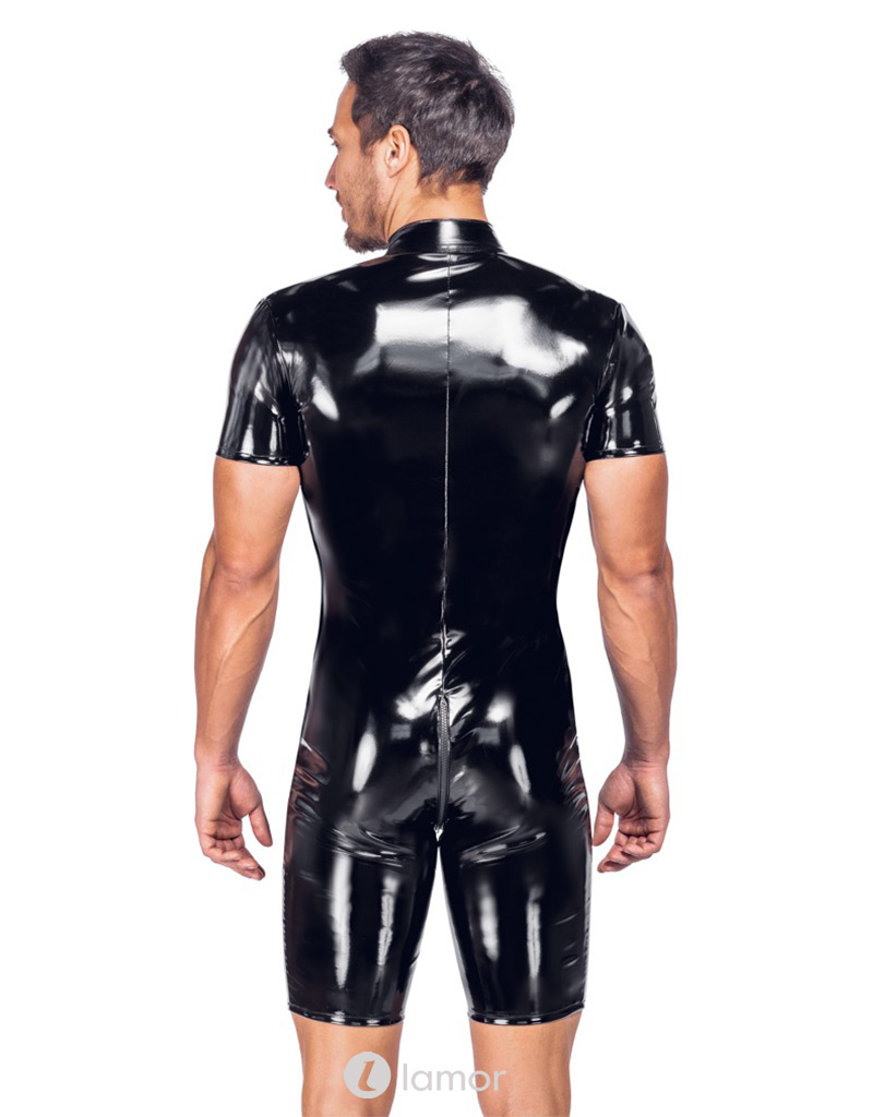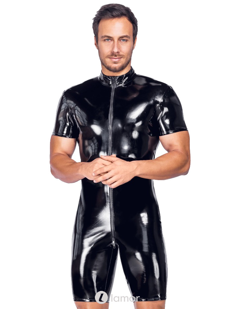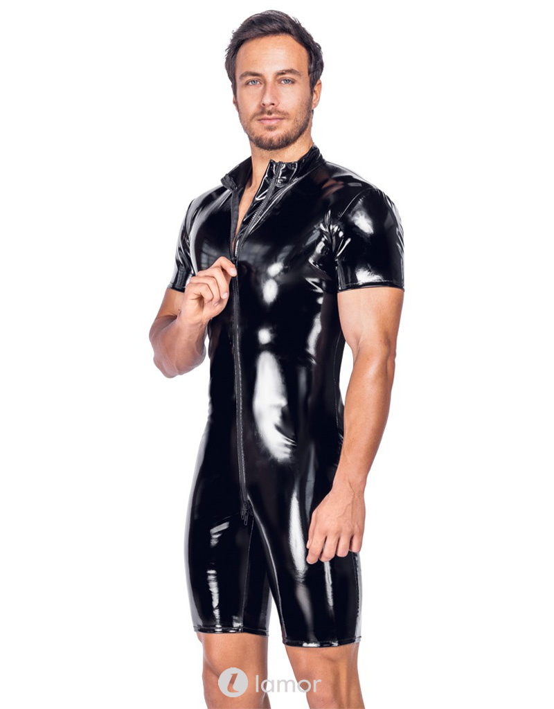 Zwarte glanzende lak jumpsuit met korte mouwen en pijpen en 3-wegrits van Black Level