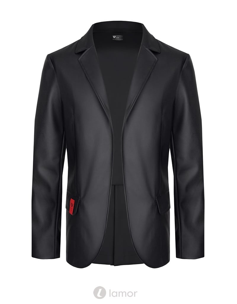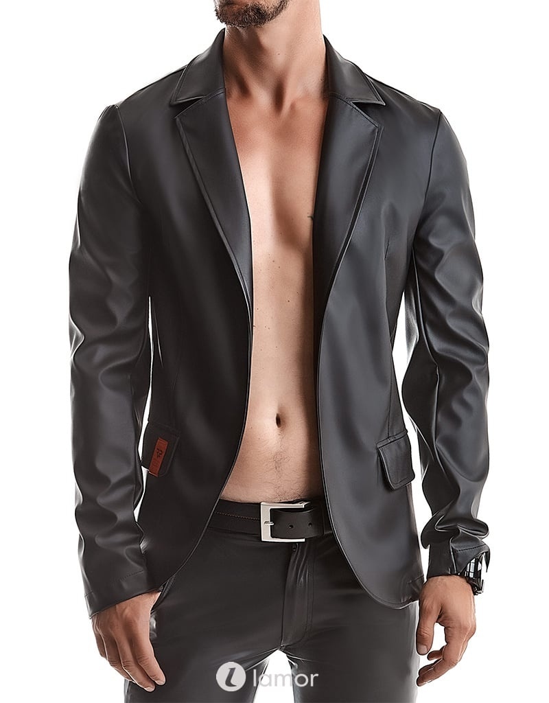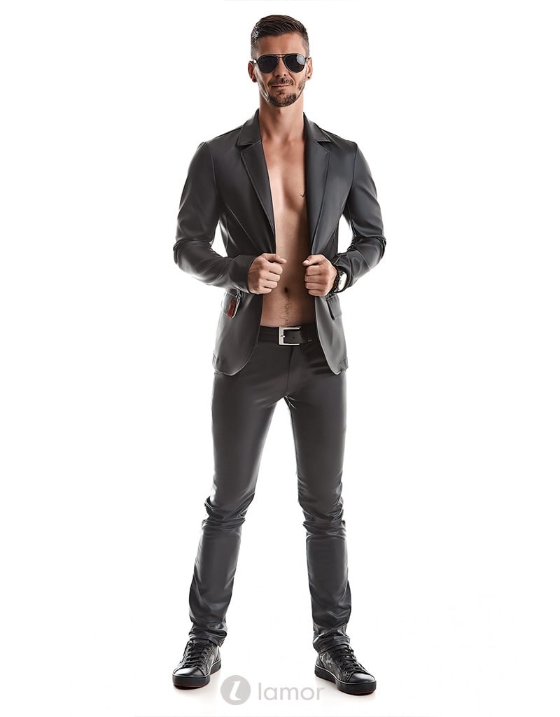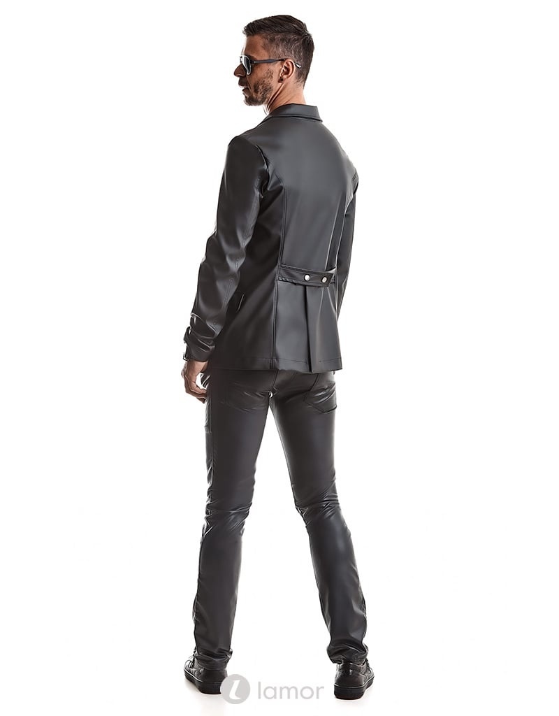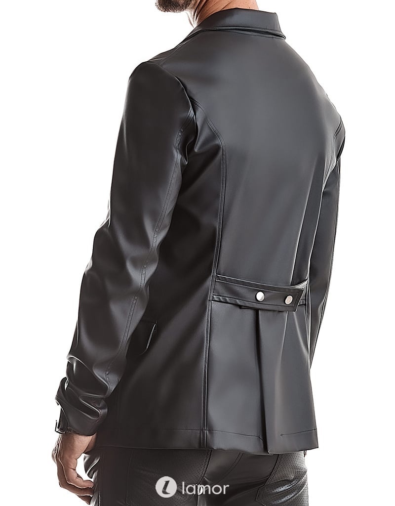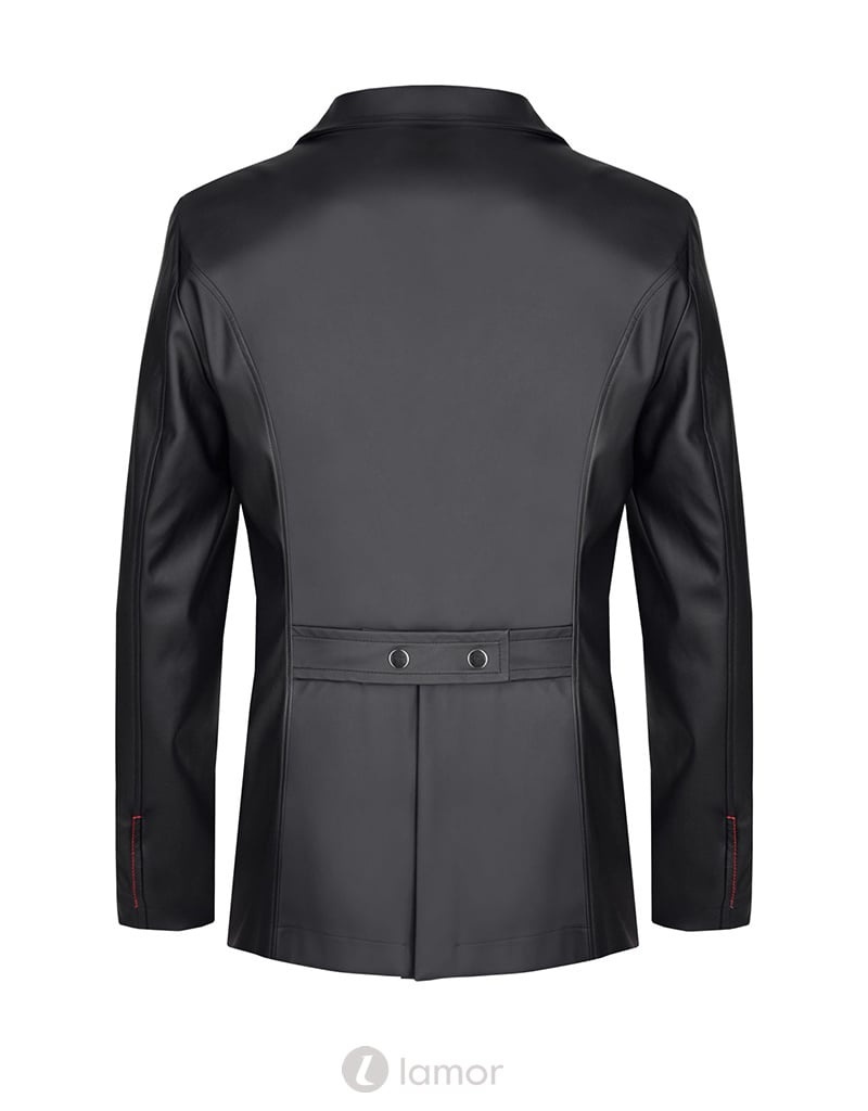 Elegante en indrukwekkende jas van hoogwaardig imitatieleer met een delicate textuur. Bijzonder opmerkelijk is het elegante karakter dat het onderscheidt. Klassiekers op de best mogelijke moderne manier. Let op de nauwsluitende vorm die het silhouet vormt en de spieren accentueert op basis van een omgekeerde driehoek. De klassieke open revers springt vooraan in het oog en harmonieert prachtig met de kraag. Zakken aan de zijkanten - perfect voor het opbergen van telefoon, portemonnee en autosleutels - afgesloten met klep. Op de rug zit een interessante horizontale riem met 2 decoratieve drukknopen. Het accentueert de taille – waardoor het silhouet slanker en aantrekkelijker wordt. De jas heeft klassieke proporties - verdeelt het silhouet in tweeën. Het eindigt in het midden van de billen, waardoor hun aantrekkelijkheid wordt benadrukt. Het rode Alcantara-label met RFP-logo en rode stippelstiksels zal iedereen bekoren die verfijnde en unieke details op prijs stelt. Het ziet er geweldig uit in combinatie met de broek RMVittorio001 zichtbaar op de foto.