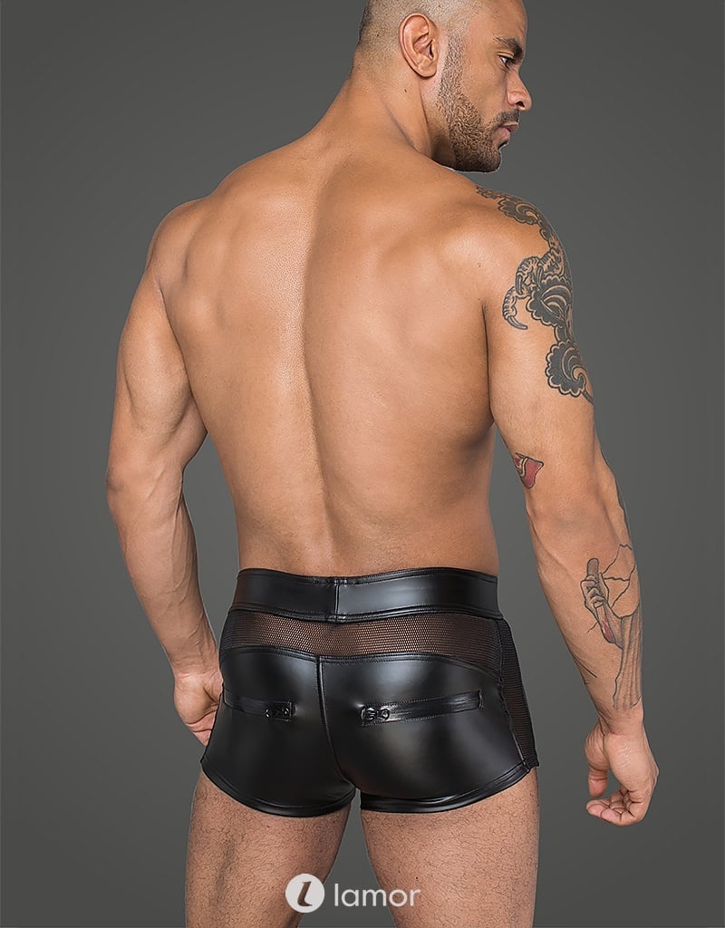 Deze broek heeft een elastische power matt look en is voorzien van dubbele mesh inzetstukken aan de voor- en achterkant, wat pure erotiek uitstraalt. Met name de mesh-hoes op de jockstrap zal zeker behagen en wellustige fantasieën opwekken. Decoratieve ritsen op de billen zorgen ook voor brutale accenten die om aandacht schreeuwen. Ten slotte zorgt de ritssluiting over de jockstrap voor snel plezier wanneer de wens opkomt.