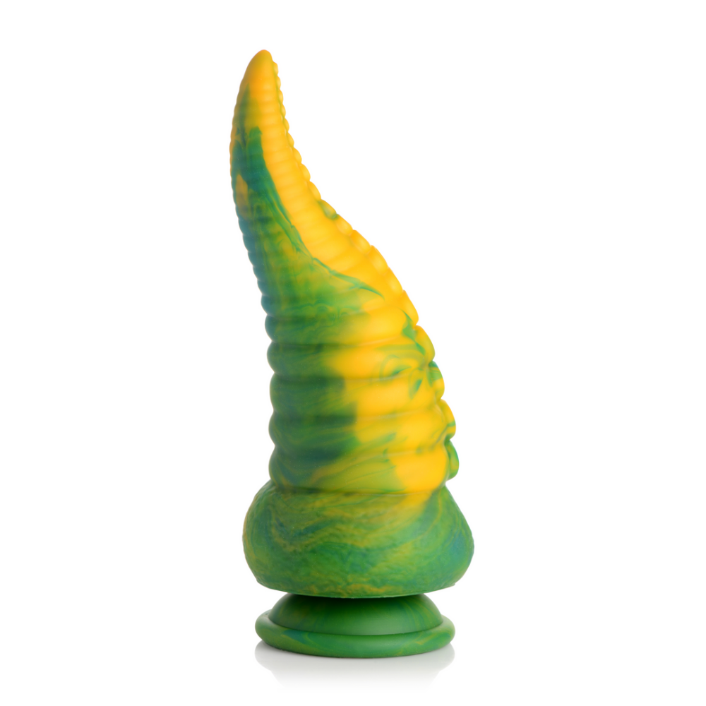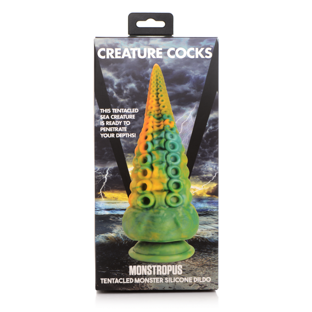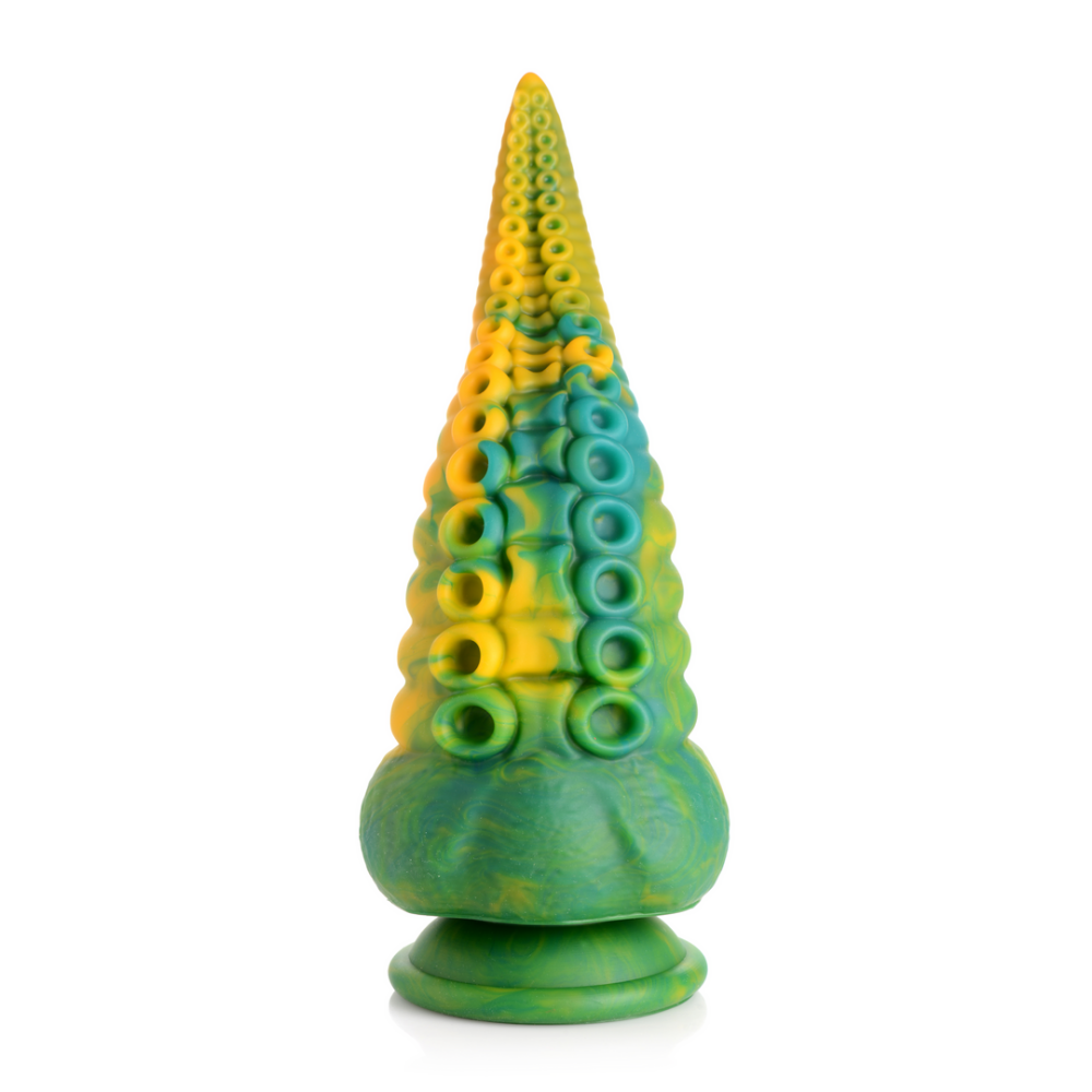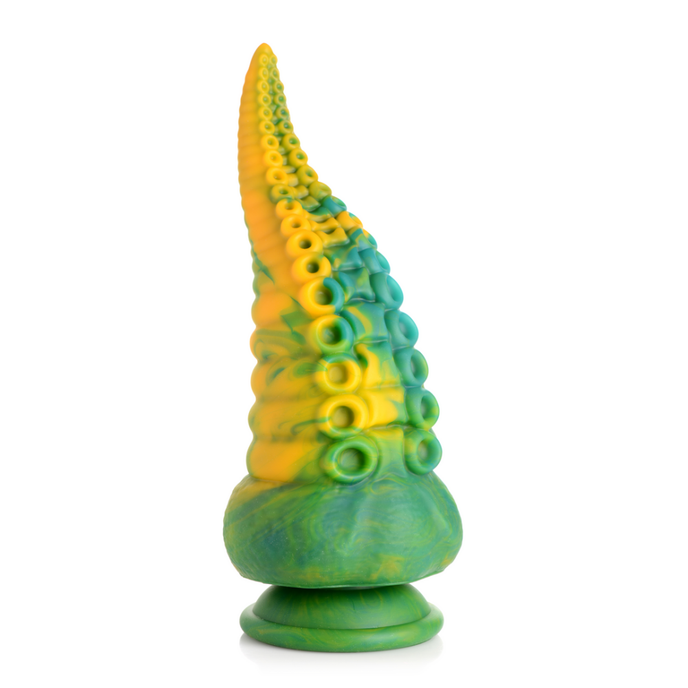Laat je fantasieën de vrije loop met tentakel-seks rollenspel! Deze lange, taps toelopende dildo heeft een marmerachtige groene, gele en blauwe kleur die uniek is voor elke dildo. Geniet van de dubbele rijen octopuszuigers, gescheiden door een vlezige richel tussen elke set zuigers. Terwijl je met je vingers, mond of openingen langs de schacht gaat, vind je ronde, cirkelvormige richels die helemaal tot aan de brede basis lopen. Geniet van elke centimeter van deze premium siliconen dildo! Gebruik hem solo en handsfree door de zuignapbasis tegen een vlakke ondergrond te drukken of combineer hem met een strap-on harnas voor spel met een partner! Deze Monster Octopus komt naar je toe vanuit de diepten van de zee en de duisternis van je afwijkende geest! Zijn tentakels wikkelen zich om je heen, proevend van elke centimeter van je huid en je lichaam beperkend. Eén monsterlijke tentakel penetreert je warme, vochtige diepten, op zoek naar wat er binnenin je zachte, soepele vlees zit! Je huivert en trilt van extase en opwinding terwijl je donkere fantasieën werkelijkheid worden! Na het spelen, was de dildo met warm water en zeep en gebruik een speelgoedreiniger om schoon te spuiten. Veeg droog en bewaar op een koele, donkere plaats uit de directe zon. Afmetingen: Totale lengte: 21,5 cm, Invoerlengte: 19,3 cm, Smalste invoerdiameter: 2,5 cm, Breedste invoerdiameter: 8,6 cm Materialen: Silicone Kleur: Marmerachtig Groen, Geel en Blauw Opmerking: Alleen gebruiken met op water gebaseerde glijmiddelen. Belangrijkste Kenmerken: Fantasie Dildo: Deze taps toelopende tentakel heeft een marmerachtig groene, gele en blauwe patroon dat uniek is voor elke dildo. De taps toelopende punt komt uit op een kleine, ronde uiteinde en verbreedt naar een grote, ronde basis. Aan één kant van de schacht bevinden zich twee rijen cefalopodenzuigers met vlezige richels ertussen en een rij ribbelige, cirkelvormige ringen die zich van de basis naar de punt van deze S-vormige, gebogen tentakelarm dildo uitstrekken. Stel een kostuum samen of gebruik je verbeelding en speel je favoriete fantasie scène uit! Zuignapbasis: Geniet van de brede, zuignapbasis van deze dildo. Druk eenvoudig stevig op een vlakke ondergrond en geniet van handsfree rijden! Harnas Compatibel: De brede, flensbasis is compatibel met de meeste strap-on harnassen, zodat je hem kunt dragen en de rol van reptiliaanse veroveraar kunt spelen! Premium Silicone: Gemaakt van lichaamsveilige, ftalaatvrije, premium silicone.