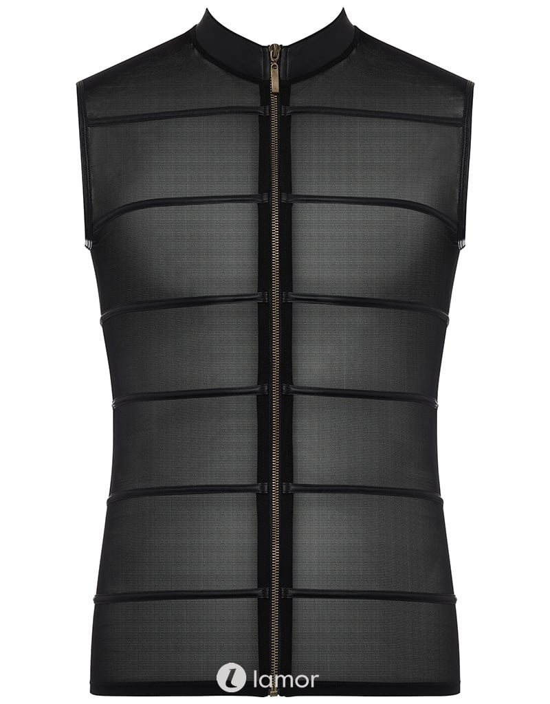 Het transparante materiaal wordt onderbroken door matte, matzwarte strepen die het shirt een spannende uitstraling geven. Het elastische shirt heeft een hoge hals met een kleine opstaande kraag en kan in enkele seconden worden geopend dankzij de doorlopende ritssluiting aan de voorkant...