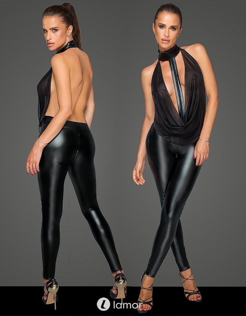 Catsuit gemaakt van een combinatie van tule en elastisch power wetlook. De broek heeft een nauwsluitende pasvorm en een gemakkelijk toegankelijke ritssluiting tussen de benen. Daarboven een semi-transparante top met watervalhalslijn en een choker met strass accenten