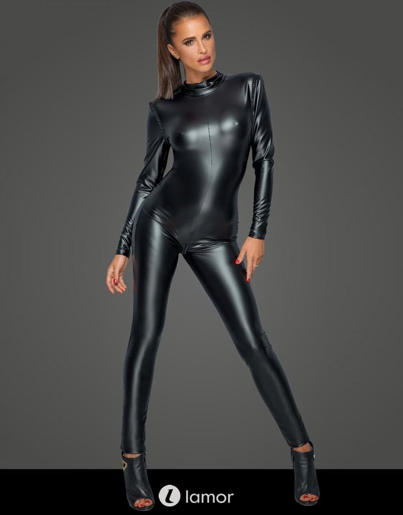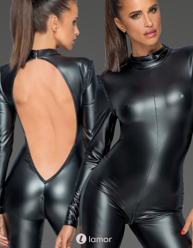 Catsuit gemaakt van Powerwetlook met ritssluiting in het kruis en sexy rug uitsnijding. Aan de onderkant van de neklijn aan de achterkant en rond de mouwen zit een decoratieve stenen band en de schoudervullingen geven de catsuit de perfecte look.