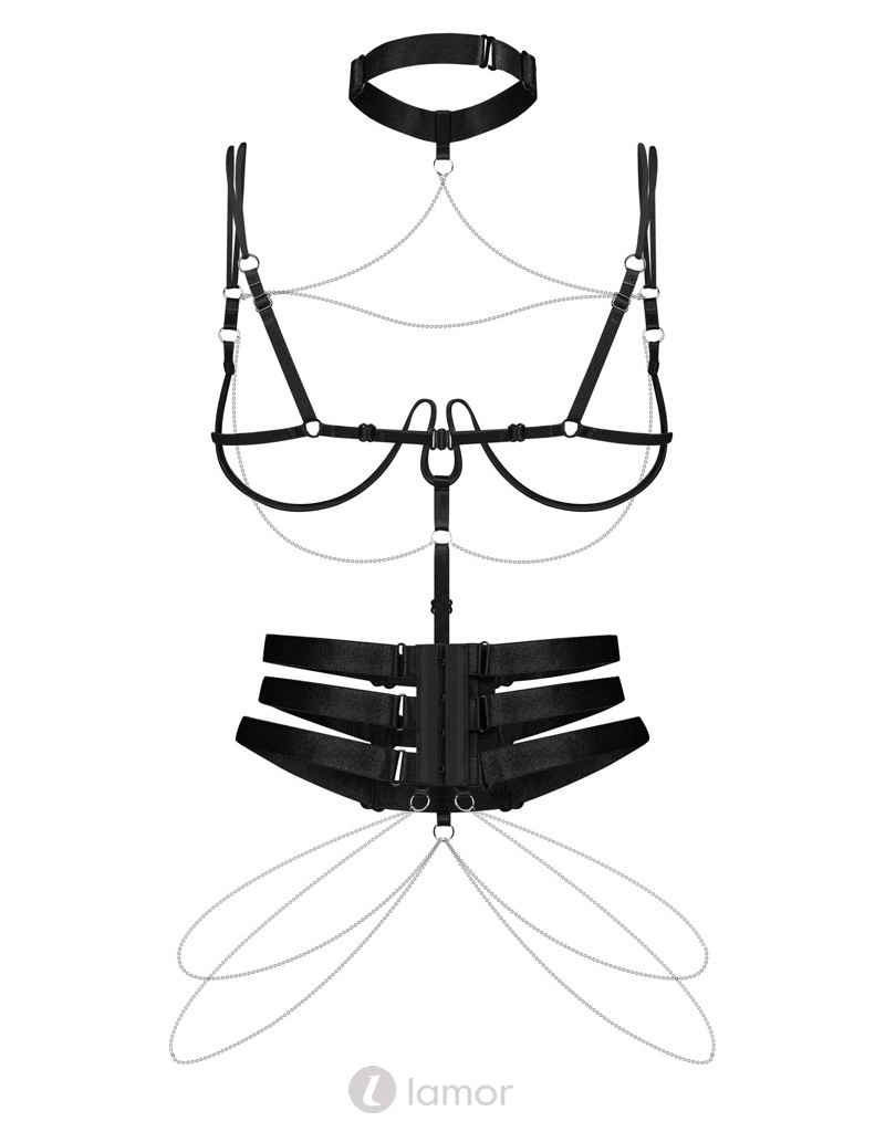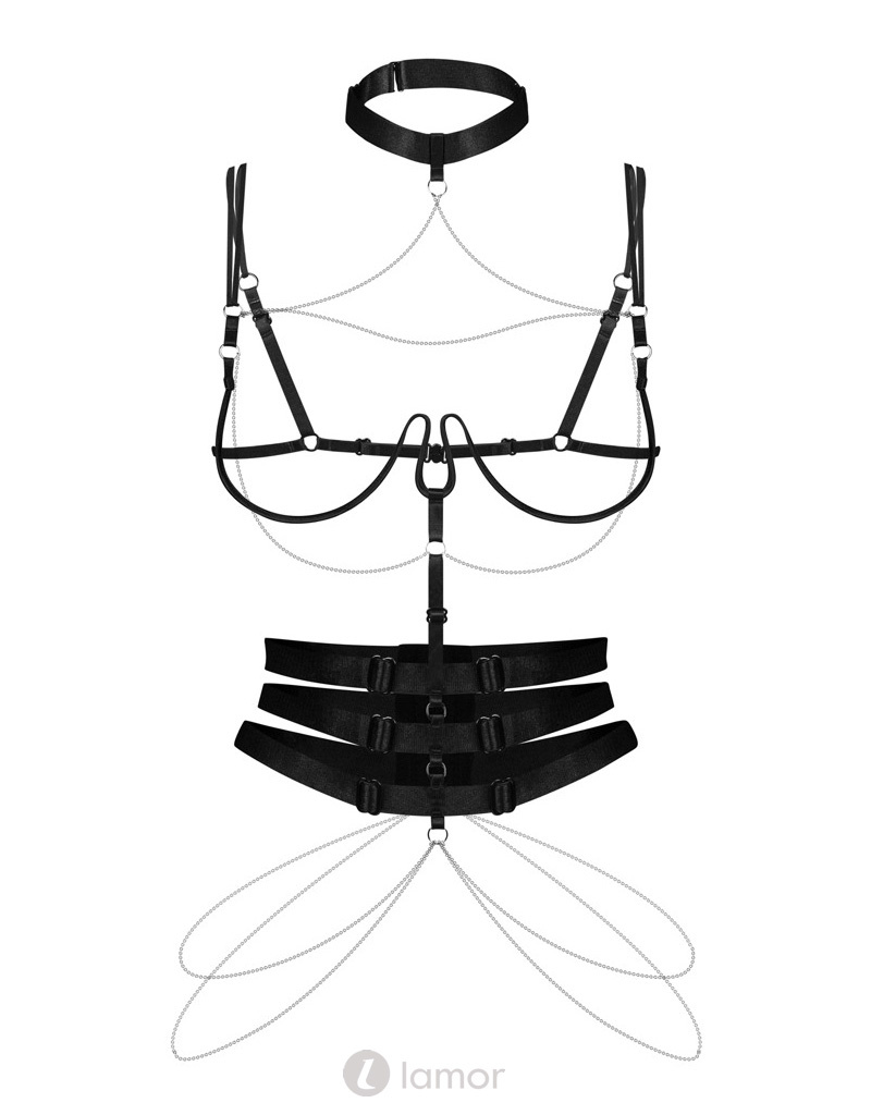 Luxe zwarte Harnas Premisis van Obsessive met choker, ouvert-BH, 3-riemen taillengordel en zilverkleurige kettinkjes in premium kwaliteit
