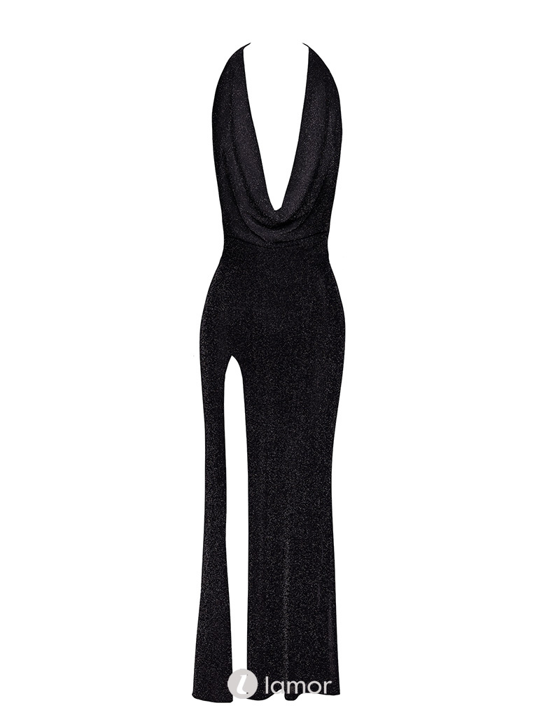 F373 Onyx Liquid Lange Jurk van Noir Handmade – Transparante avondjurk van tule met zilverdraad, diepe halslijn en open rug