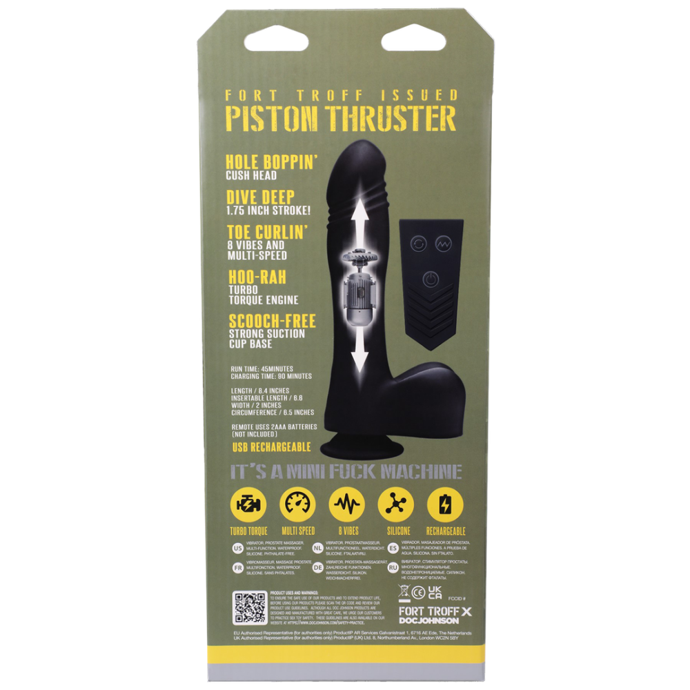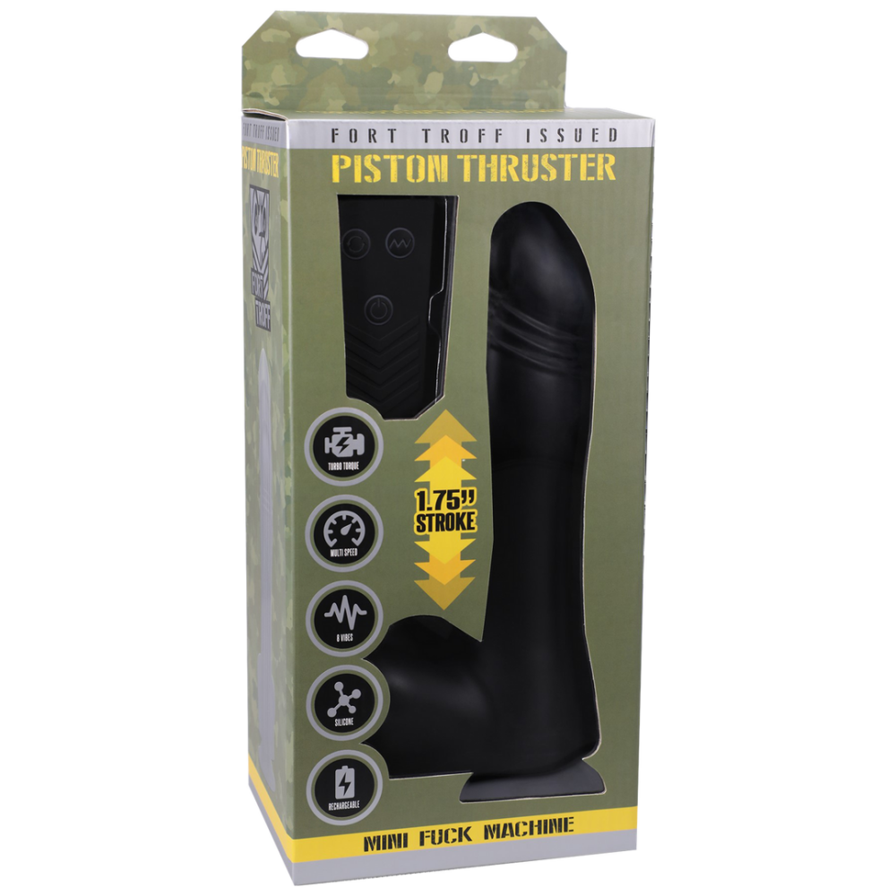 Met de Piston Thruster draait alles om de heen-en-weer slag om het echte gevoel van een harde klap Top te leveren. Met een slag van net onder de 2 inch, komt de Piston Thruster bijna overeen met de slag van grote fuck machines. De supercharged motoren van de Piston Thruster leveren de kracht om diep door te dringen. We hebben ervoor gezorgd dat hij sterk genoeg is om de strakste gaten te penetreren. De paddestoelvormige kop is super zacht en comfortabel, voor gemakkelijke toegang. Deze power top bedienen is eenvoudig… gebruik de afstandsbediening of de knoppen op de ballen. Je hebt 2 snelheden van fokken, die iets snellere versies van de basis slag bieden. In tegenstelling tot traditionele fuck machines, biedt de onze ook 8 vibratie-instellingen. Aangedreven door een state-of-the-art lithium batterij, is de looptijd ongeveer 45 minuten. USB oplaadbaar, en het duurt ongeveer 1,5 uur om op te laden. Gemaakt van Premium Liquid Silicone, zodat je elke soort lube kunt gebruiken. Hoewel de Piston Thruster niet fluisterstil is, vonden we dat een motor met een beetje gebrul essentieel was om de duw te leveren die varkensgaten verlangen.