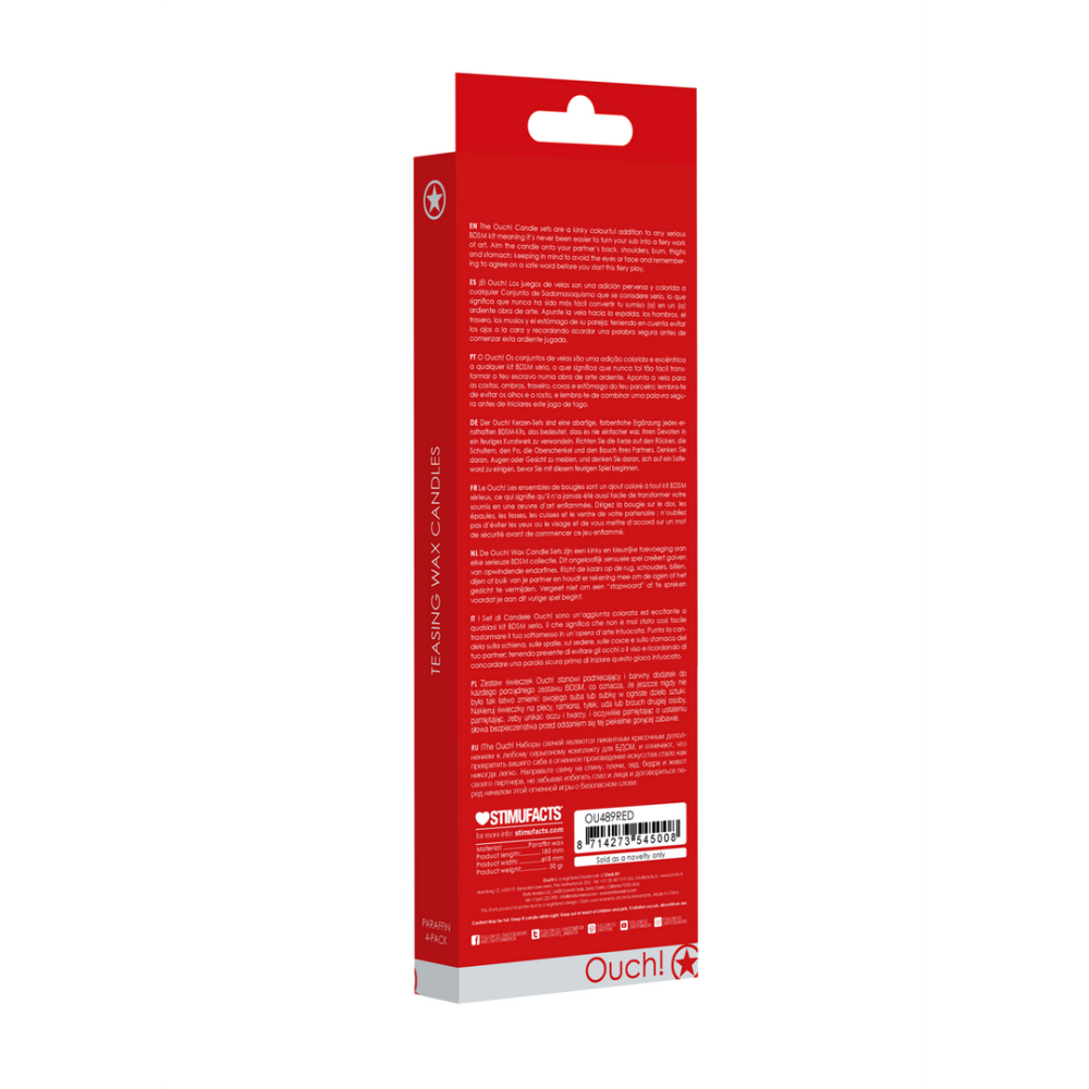Beschrijving De Ouch! Wax Candle Sets zijn een kinky en kleurrijke toevoeging aan elke serieuze BDSM collectie. Dit ongelooflijk sensuele spel creëert golven van opwindende endorfines. Richt de kaars op de rug, schouders, billen, dijen of buik van je partner en houdt er rekening mee om de ogen of het gezicht te vermijden. Vergeet niet om een “stopwoord af te spreken voordat je aan dit vurige spel begint