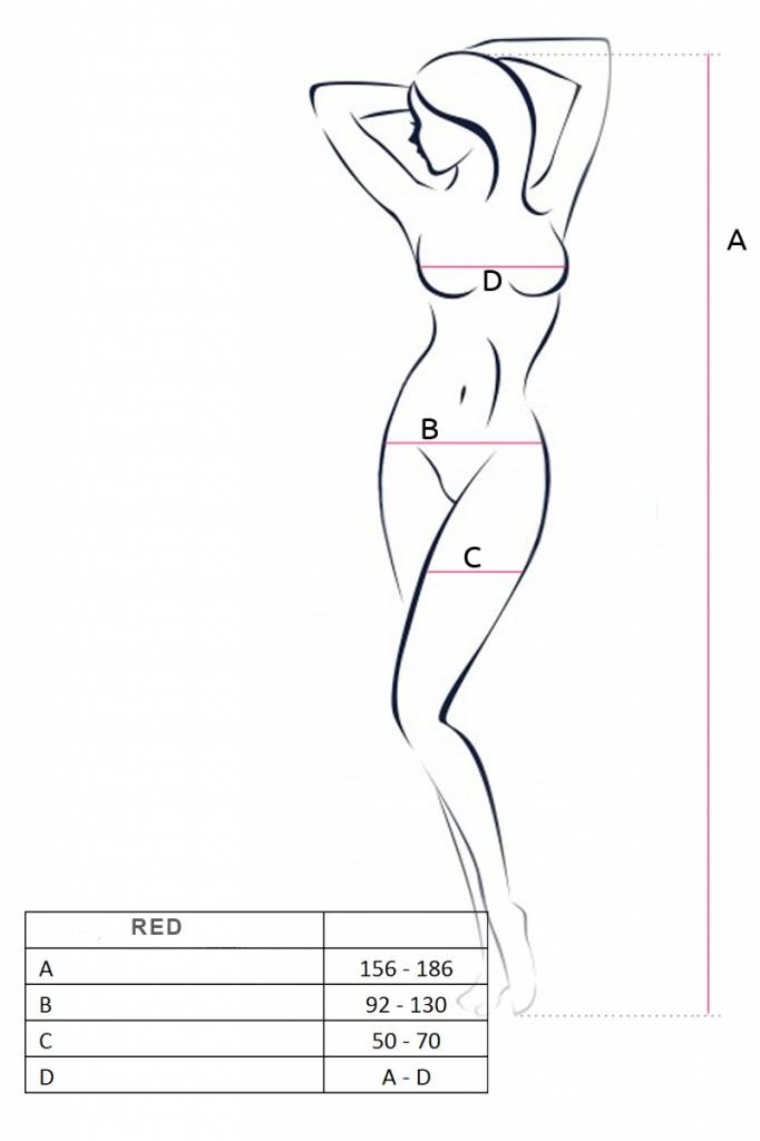 Het bodysuit is gemaakt van een delicate, rode elastische mesh dat perfect om het lichaam past. Prachtig bewerkt met openingen op decollete en benen.De ruimte tussen het bovendeel van de bodystocking creëer het effect van een jarretellengordel.