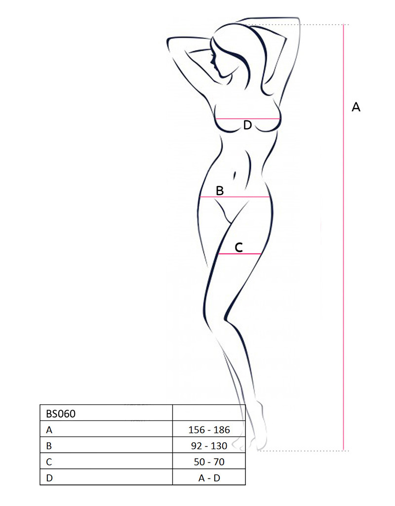 De bodystocking is gemaakt van fijn tule in combinatie van geruit gaas. De nekbanden zijn breed en dicht geweven eveneens als het imitatie slipje. Twee dicht geweven banden op de dijen verbinden het bovenste en onderste gedeelte met elkaar
