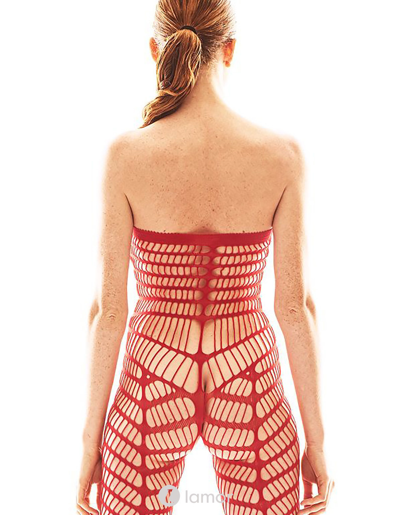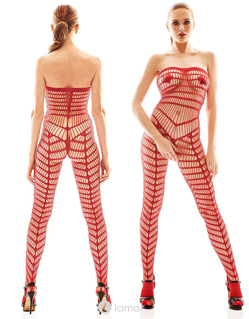 Orica is een sexy hoogwaardige en opwindende strapless bodystocking van elastisch grofmazige rood net materiaal. De bodystocking is extra versterkt op de tenen en heeft een open kruis.