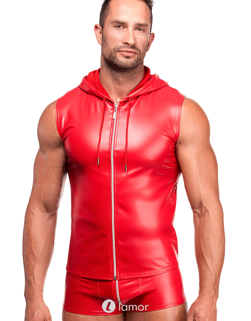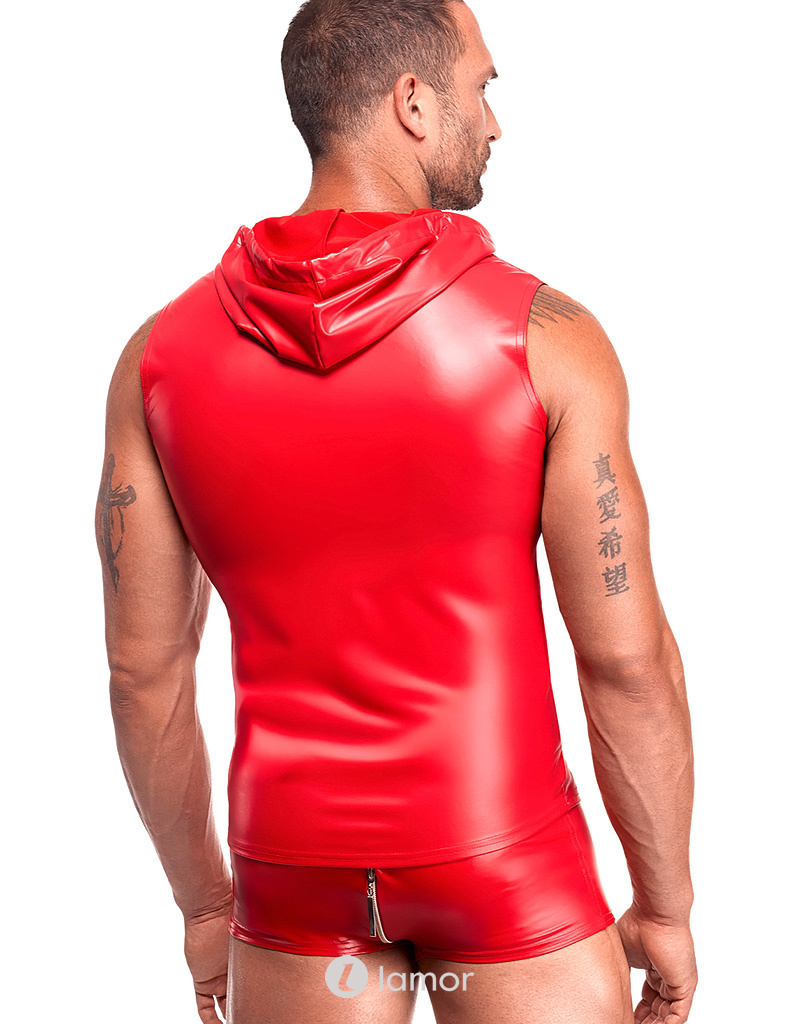 Noir Handmade rode powerwetlook top met capuchon en rits