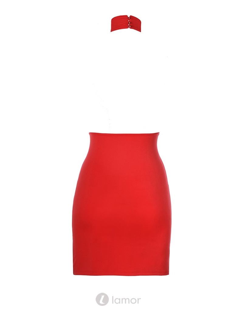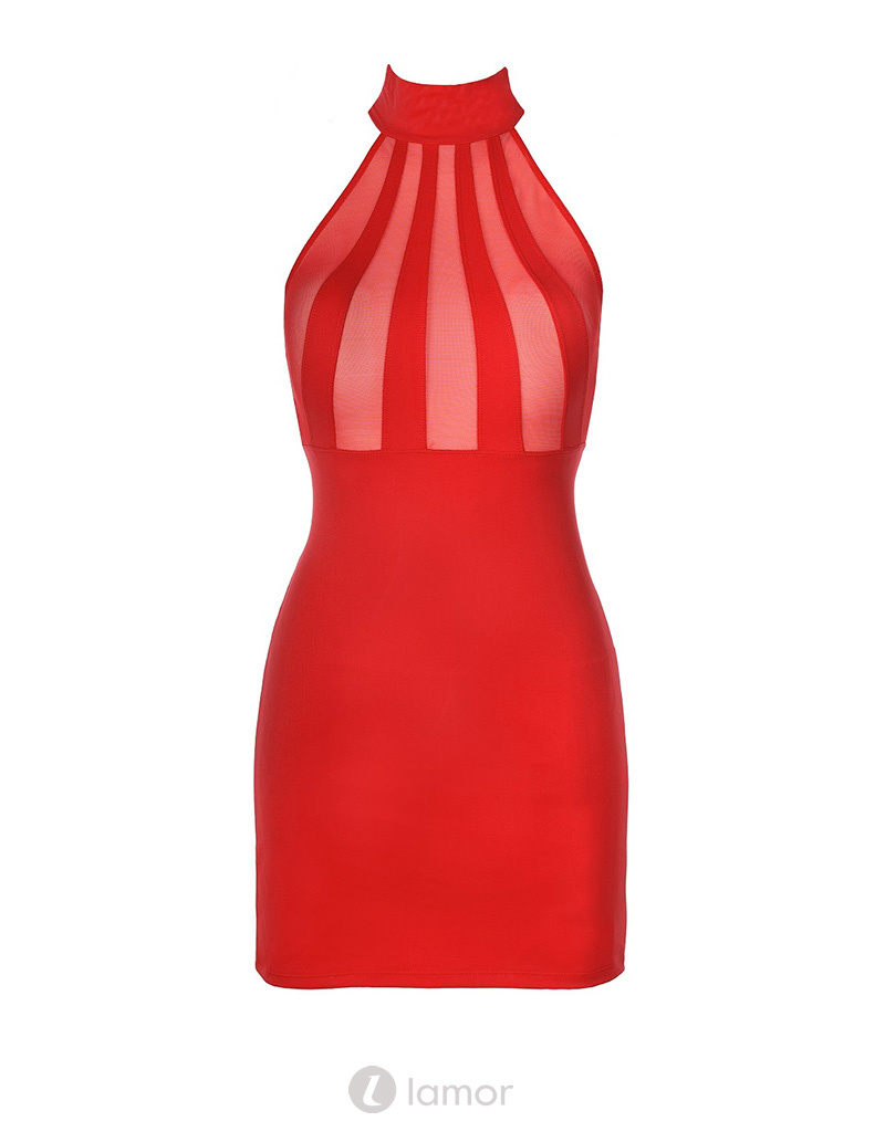 Verleidelijk rood neckholder jurkje van elastisch materiaal en fijn tule met open rug