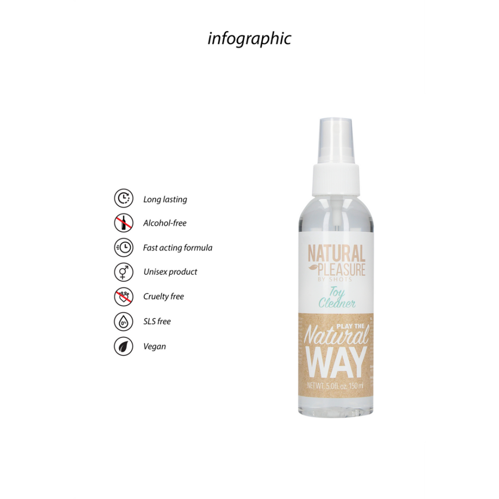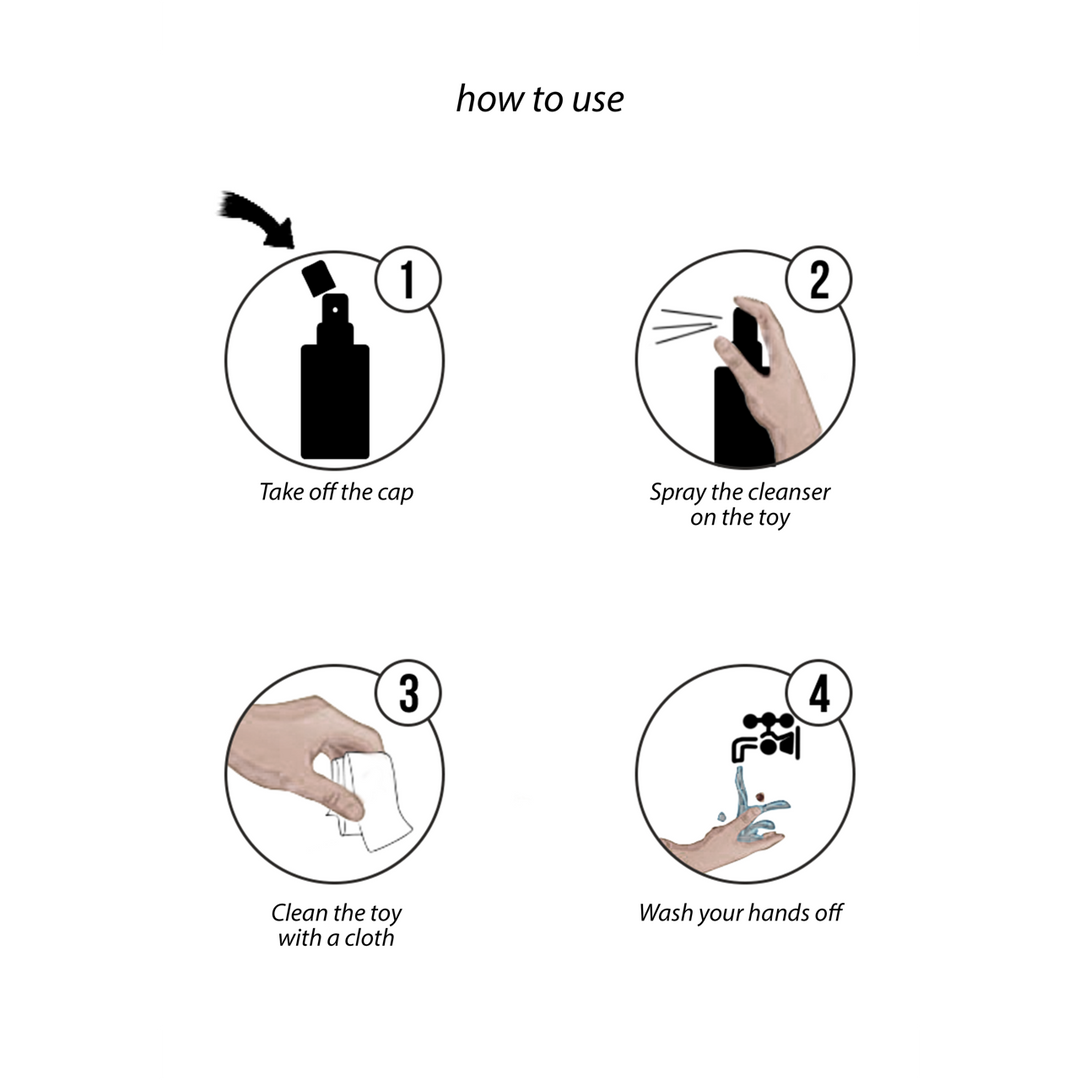 Beschrijving Toy Cleaner: Een onmiddellijke en effectieve spray voor het reinigen van erotisch speelgoed. Toepassing:Spuit direct op het oppervlak van het te reiningen product. Spoel af met water of gebruik een vochtige doek. Wrijf het vervolgens droog. Dit product bevat geen kleurstoffen, parabenen, fosfaten, chloor, ammonia of zuren. Vol met natuurlijke ingrediënten, minstens 95% biologisch afbreekbaar. Bewaring:In de originele verpakking bij kamertemperatuur. Veiligheidsinformatie: Amfotere oppervlakteactieve stoffen, anionogene oppervlakteactieve stoffen 5%, Sodium Benzoate.