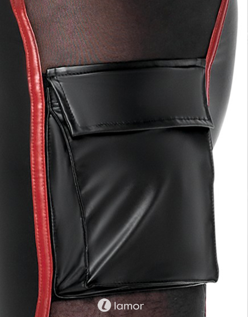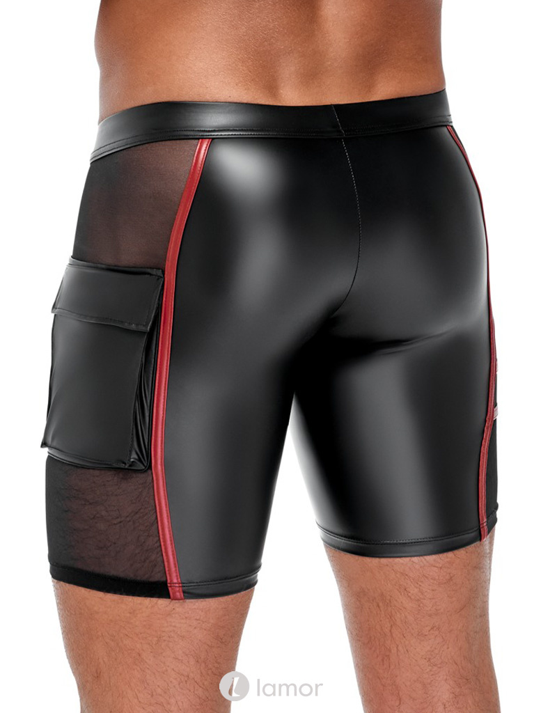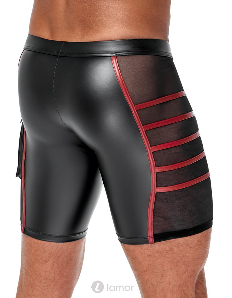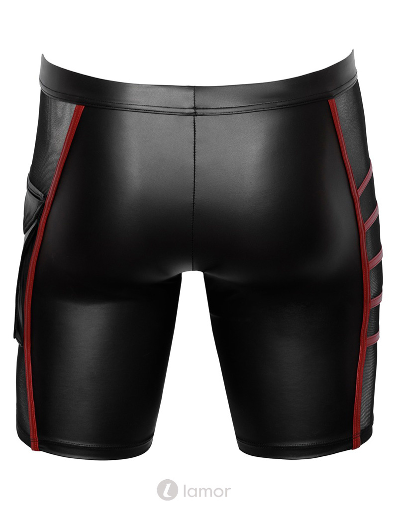 Strakke zwarte Mattlook shorts van NEK met rode contraststrepen, net-inzetten en klappenzak