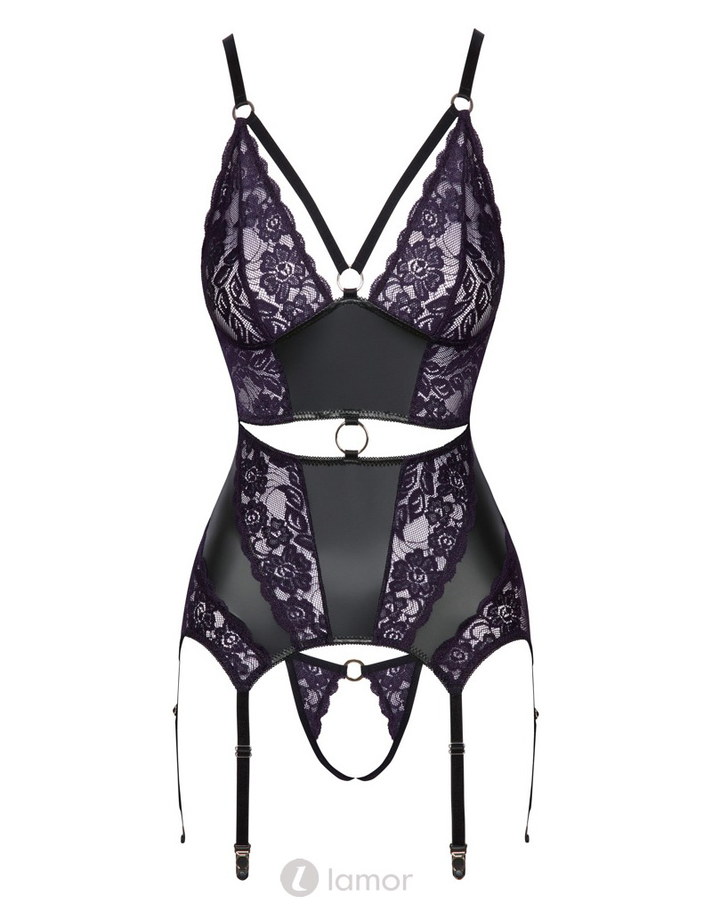 Elegante verleiding in zwart en donkerpaars – deze Cottelli Lingerie Strapshemd & String Ouvert set combineert luxe materialen met een sensueel design.
