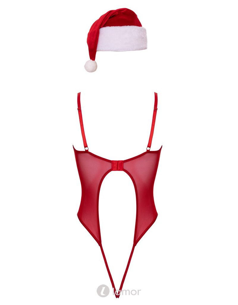 Cottelli Lingerie X-Mas stringbody van rood powernet met witte verenrand en kerstmuts