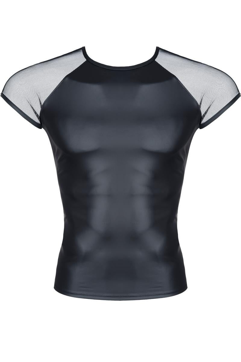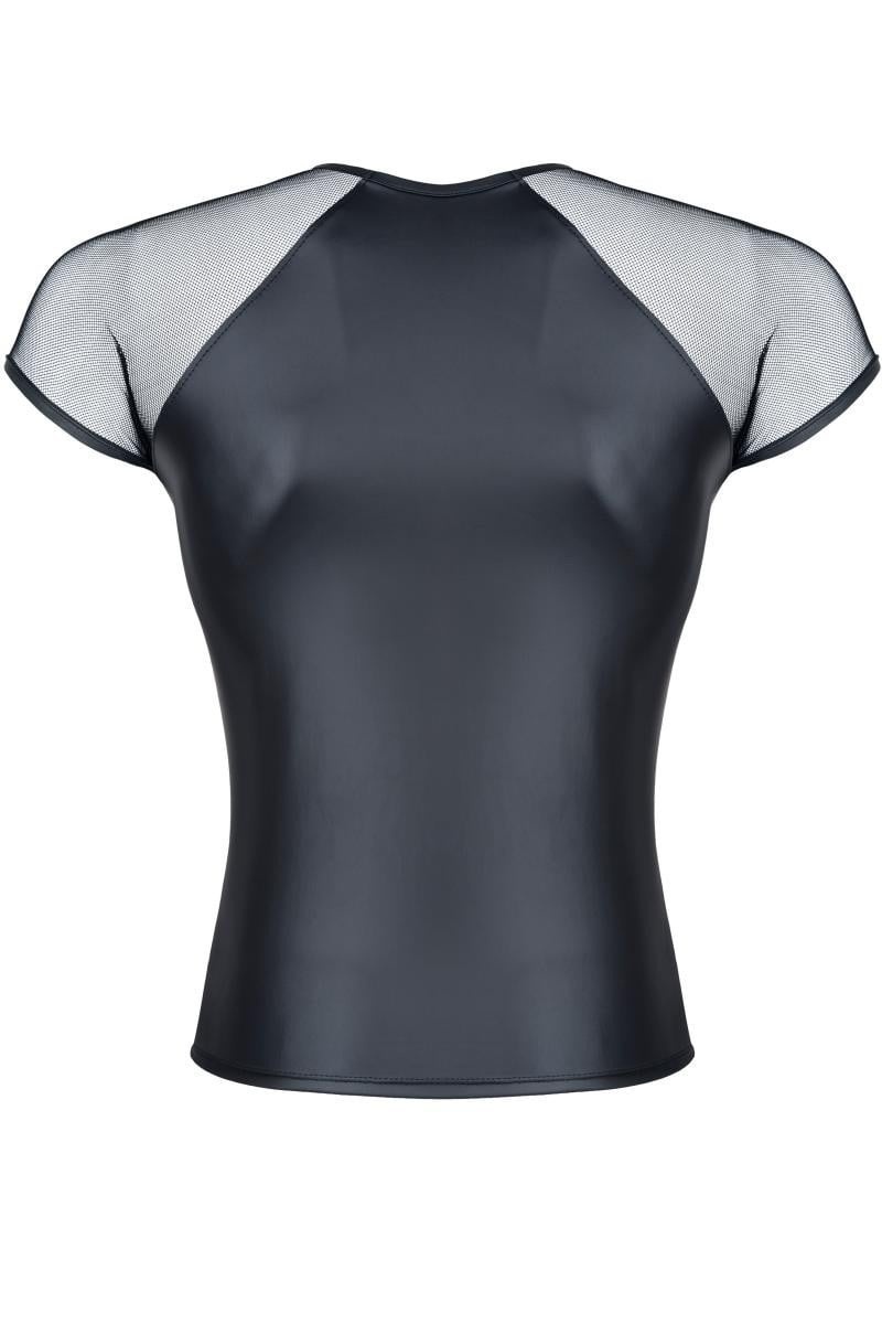 T-shirt, gemaakt van stretchy mat wetlook materiaal en mesh mouwtjes.