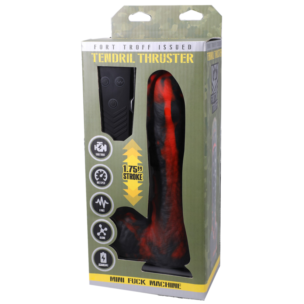 Met de Tendril Thruster draait het allemaal om de heen-en-weer slag om het gevoel van een harde kloppende textuur te geven. Met een slag van net iets minder dan 2 inch, komt de Tendril Thruster bijna overeen met de slag van grote fuckmachines. De supercharged motoren van de Tendril Thruster leveren de kracht om diep te penetreren. We hebben ervoor gezorgd dat hij sterk genoeg is om de strakste gaten te doorboren. De paddestoelvormige kop is super zacht en comfortabel, voor gemakkelijke toegang, en de tendrils bieden extra stimulatie. Het bedienen van deze power top is eenvoudig… gebruik de afstandsbediening of de knoppen op de ballen. Je hebt 2 snelheden van fokken, die iets snellere versies van de basis slag bieden. In tegenstelling tot traditionele fuckmachines biedt de onze ook 8 vibratie-instellingen. Aangedreven door een geavanceerde lithiumbatterij, is de looptijd ongeveer 45 minuten. USB-oplaadbaar, en het duurt ongeveer 1,5 uur om op te laden. Gemaakt van Premium Liquid Silicone, zodat je elke soort glijmiddel kunt gebruiken. Hoewel de Tendril Thruster niet fluisterstil is, vonden we dat een motor met een beetje gebrul essentieel was om de kracht te leveren waar varkensgaten naar verlangen.