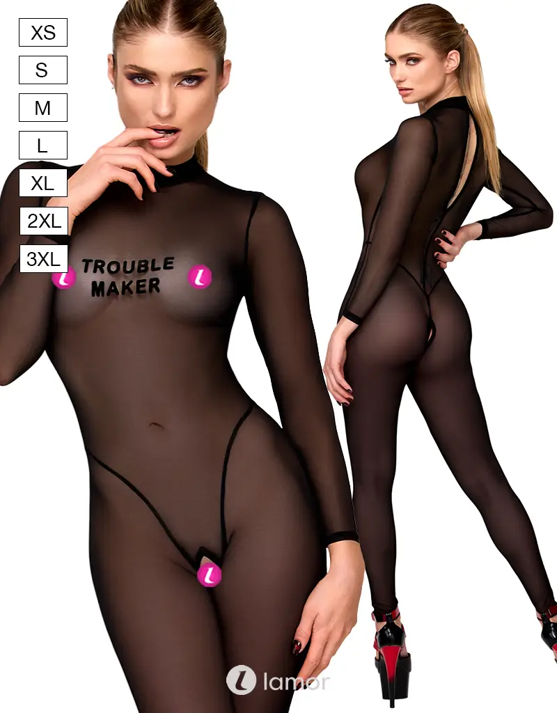 Noir Handmade F387 Troublemaker catsuit open kruis flock print zwart