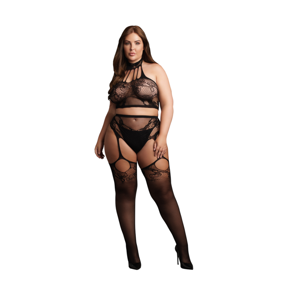 Twee Delige Set met Halter Turtleneck en Pantie met Aangehechte Kousen - OSX - Zwart