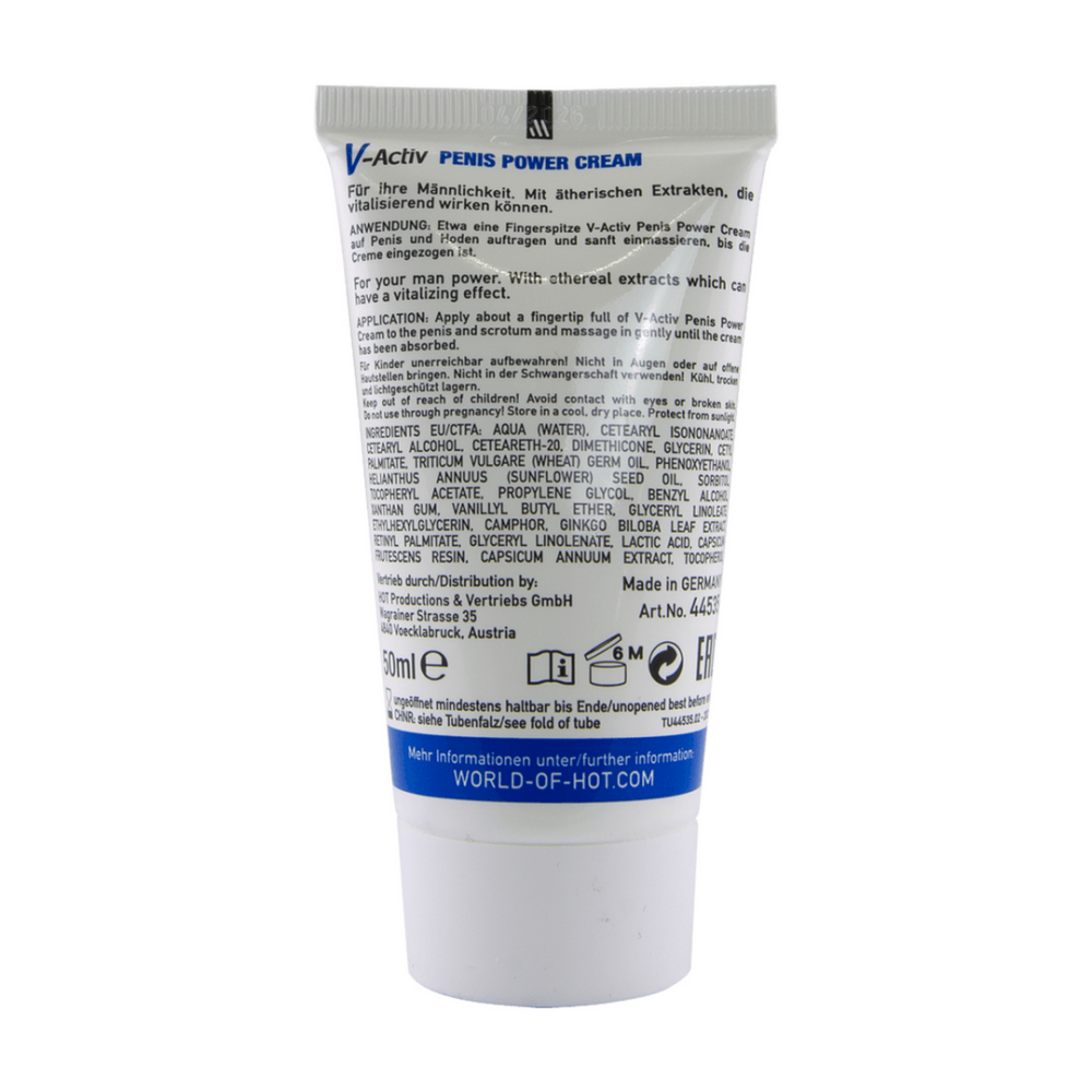 Beschrijving HOT V-ACTIV PENIS POWER CREAM Onderscheidt zich door zijn bijzondere combinatie van stimulerende bloedsomloop en verzorgende ingrediënten. Hoge kwaliteit Penis Power Cream Men kan uw prestaties een boost geven. Bij dagelijks gebruik kan deze crème positieve effecten hebben, zoals het verhogen van de vitaliteit en het welzijn. Masseer deze crème 's ochtends en 's avonds in. De V-aktiv Penis Power Cream kan ook direct voor een aangename doorbloeding van de penis zorgen. Breng aan op uw vingertop en masseer zachtjes in penis en testikels. Voorspel kan erg erotisch worden gemaakt als de partner de controle over het masseren overneemt. Bevat natuurlijk ginkgo-extract.